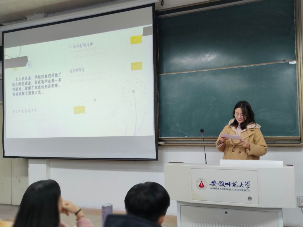 分享自强故事,强化示范效应。12月5日晚,2021级行政管理和社会学类联合开展“暖冬”故事分享会。行政管理专业小陈同学回顾了入学以来参与的班委竞选、“挑战杯”比赛、“苔花”励志班、志愿者服务等活动足迹,表示今后要常怀感恩之心,助力社会发展。社会学类小麦和小古同学则相继讲诉了自己从初到芜湖对环境不适应,到学校“绿色通道”“暖冬行动”“石榴籽班”给她们带来温暖化解不安的心路历程,表达了自己对党和国家、对学校和老师、对同学和室友的感激之情。通过宣传家庭经济困难学生自强自立的感人事迹,学院致力于引导青年学生树立正确的世界观、人生观、价值观。
