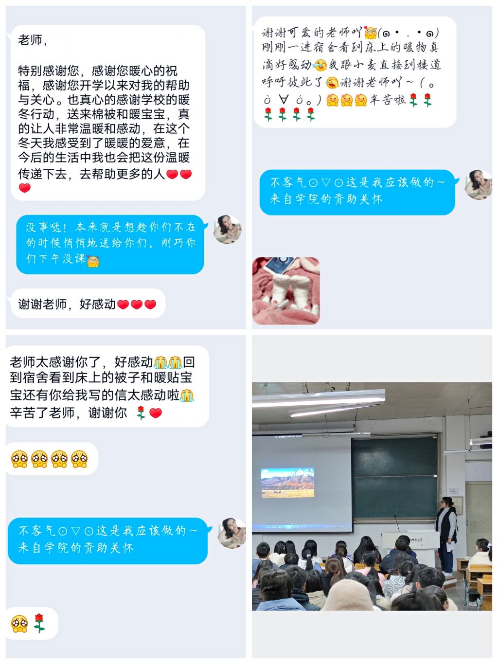 开展暖冬慰问,加强情感关怀。12月初,学院领导班子带头开展“温暖进宿舍”活动。一包包毛毯,连同一张张由辅导员亲手书写暖冬寄语的明信片,陆陆续续被送到了学生宿舍里。受助学子当天纷纷向辅导员发送了一条条感情真挚的“回信”,展现出学院学子心向阳光、心存感恩的美好品质;2021级社会学类两名受助学生精心剪辑制作了短视频,以此向班级同学介绍自己的家乡美景,表达对学院老师亲切关怀的感激之情。此外,学院开展2022届考研慰问活动,帮助毕业班困难学生舒缓备考和就业压力,引导其以更加积极的心态迎接考试,成长为身心健康、全面发展的优秀人才。