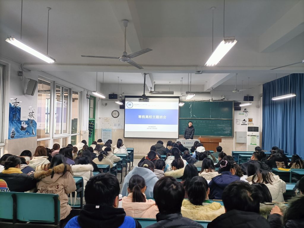 张楠楠简要介绍离校流程,要求切实履行登记手续,返乡后及时发短信报平安;强调要认真遵守疫情防控要求,出行佩戴口罩,非必要不出门。他还提醒同学们注意自己在网络上的言行,网络不是法外之地,不要在网络上发表不当言论,做有理想、有道德、有文化、有纪律的青年大学生;寒假期间,积极从事文明、健康的文化娱乐、社会公益活动和假期阅读活动,远离赌博、酗酒、传销、宗教、封建迷信等活动。另外,张楠楠强调假期做好安排,及时关注就业信息,努力提升自己,早日找到理想工作。