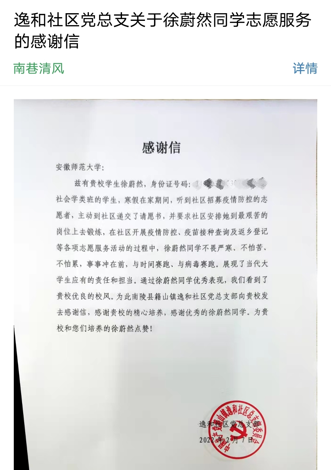 徐蔚然是36365线路检测中心2021级社会学类2班的一位同学,来自芜湖市南陵县。对她而言,这个假期最有意义的事莫过于加入社区疫情防控志愿服务队伍中来。在社区开展疫情防控、疫苗接种查询及返乡登记等各项志愿服务活动的过程中,都能看见她忙碌的身影。徐蔚然不畏严寒、不怕苦、不怕累,工作认真负责,展现了新时代青年的责任担当,发扬了乐于奉献的优良校风。
