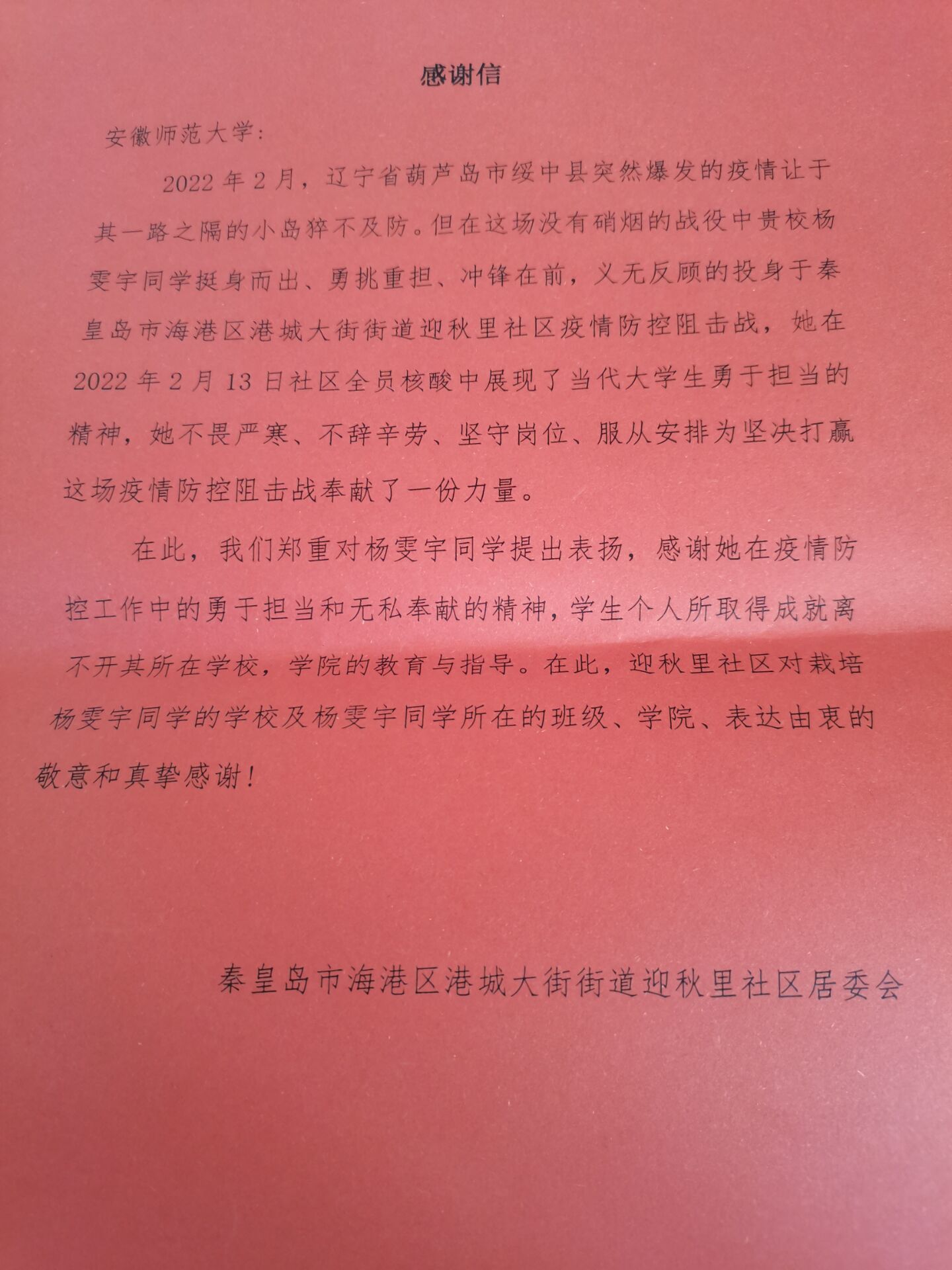 来自河北秦皇岛的杨雯宇同学假期返乡后,辽宁省葫芦岛市突然爆发疫情,她没有一丝犹豫主动联系社区,加入到疫情防控志愿服务队伍当中,负责登记社会每家每户的核酸检测情况。她说:“穿上‘红马甲’意味着一种责任,虽然天气寒冷,但想到在家乡疫情防控工作中发光发热就会异常兴奋。”开学前夕,杨同学依依不舍地脱下了“红马甲”,社区管理人员纷纷表示,从她身上感受到了当代青年学子对国家真挚的情感、勇于承担责任和使命,社区为此专门向36365线路检测中心寄去了感谢信。
