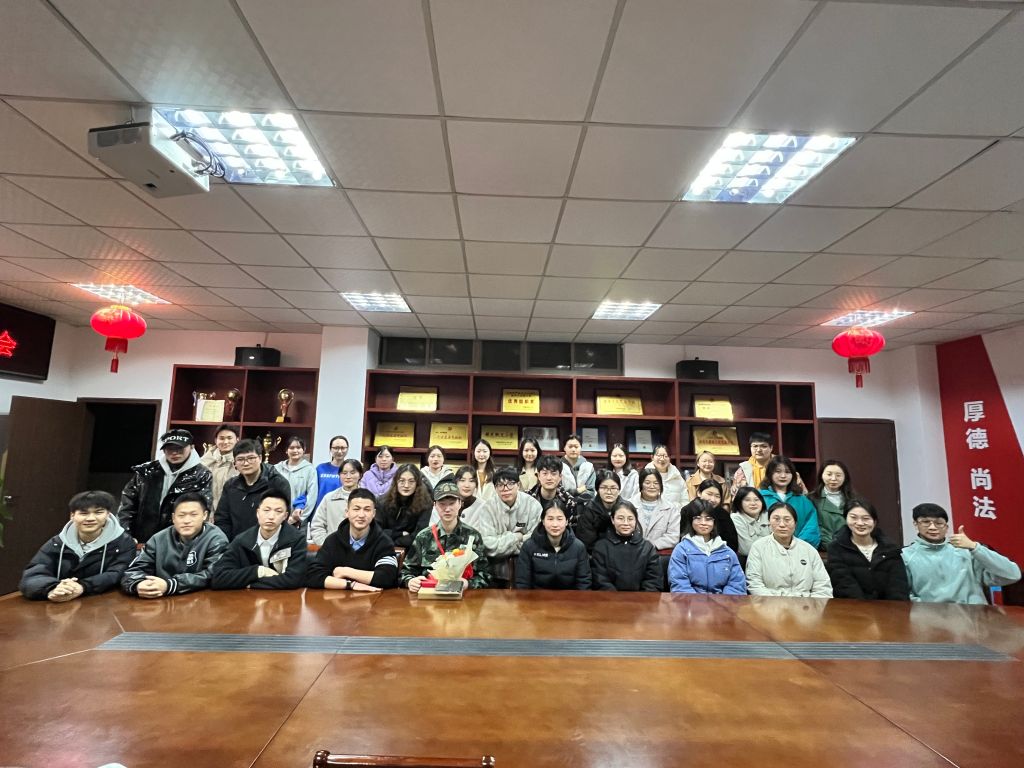 “师生同寄语”——辅导员陈朋为习佳铭佩戴光荣花,鼓励他要在中国梦、强军梦的指引下,立志成才报国,争做合格军人。班级同学也纷纷送上自己准备的礼物,表达自己最真挚的祝愿。会后,习佳铭同学身穿戎装、佩戴光荣花与大家合影留恋。