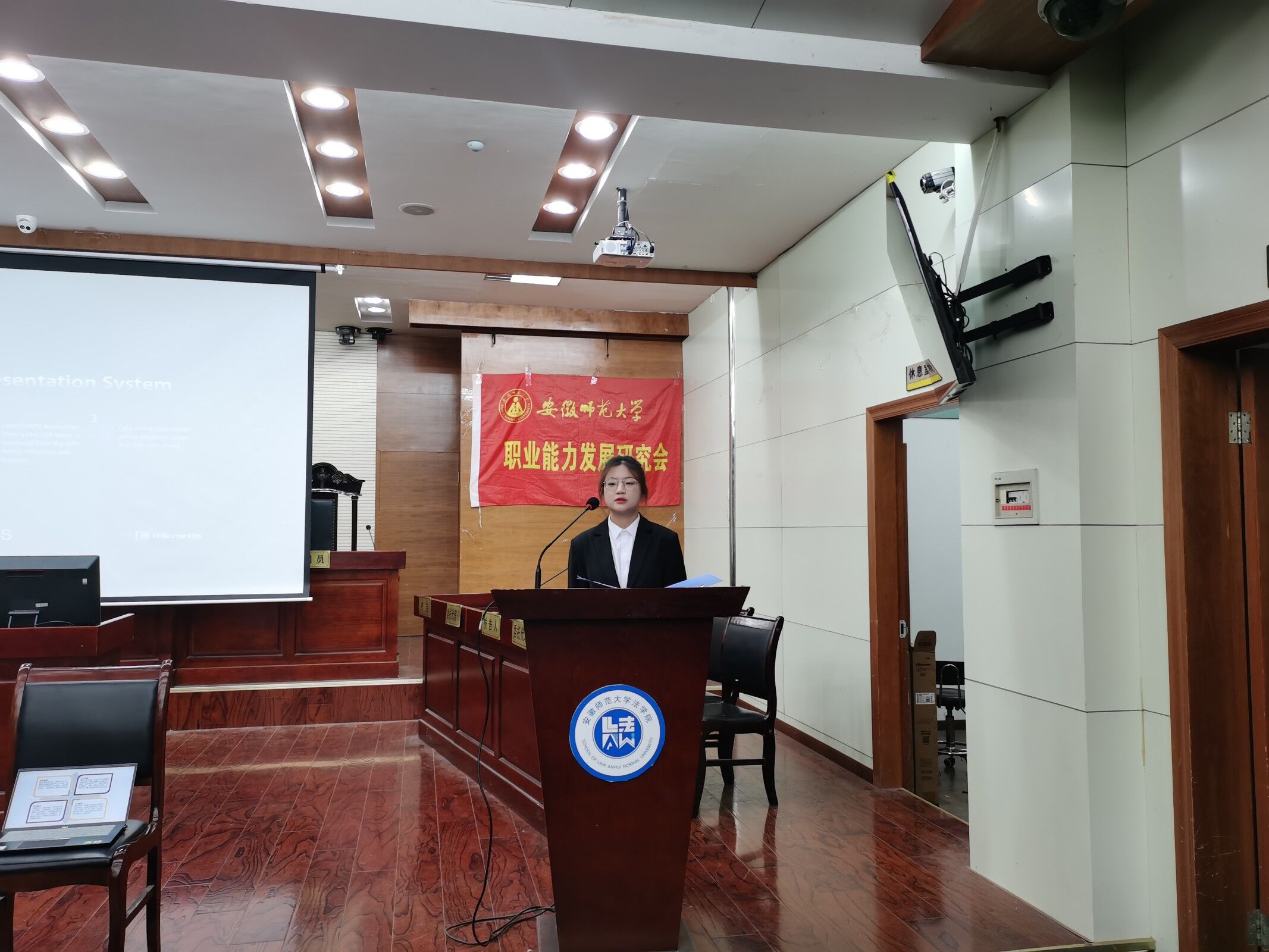 本网讯 (职业能力发展研究会 王冰俏)5月15日,职业能力发展研究会于花津校区教学法庭举办2021-2022学年“2+2”闯关公务员决赛。陈鹏、纪媛媛、王焕炎三位指导老师受邀到场,外交与国际事务研究协会副会长蒋亦菲、职业能力发展研究会会长包文静、青年法学社综合部负责人苏娜、社团管理部负责人朱睿祺以及校社联活动评鉴组参与决赛评审,综合部理事郁胜香、胡悦凯主持此次比赛。