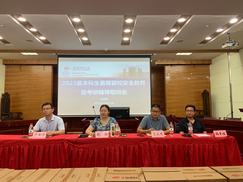 本网讯(36365线路检测中心 王赫赫 侯亚婕)2022年7月22日上午九点,36365线路检测中心于大学生活动中心教学模拟法庭召开2023届本科生暑期留校安全教育暨考研辅导慰问会,学院党委书记赵红、党委副书记张玉新、副院长高永周、社会学专业负责人路幸福、2019级社会学类辅导员崔健以及2019级行管、法学专业兼职辅导员李嘉宝、王赫赫出席会议。会议由党委副书记张玉新主持。