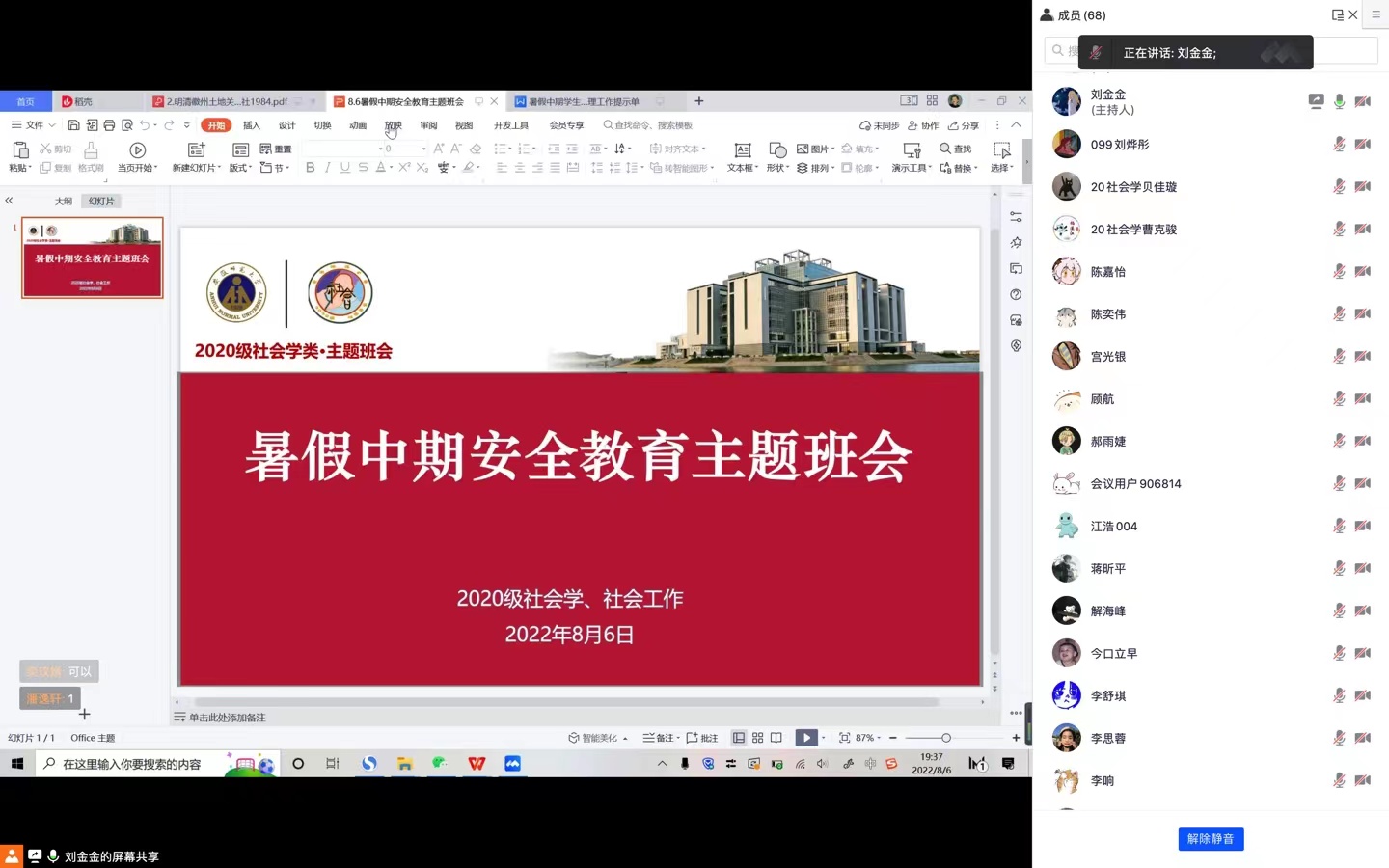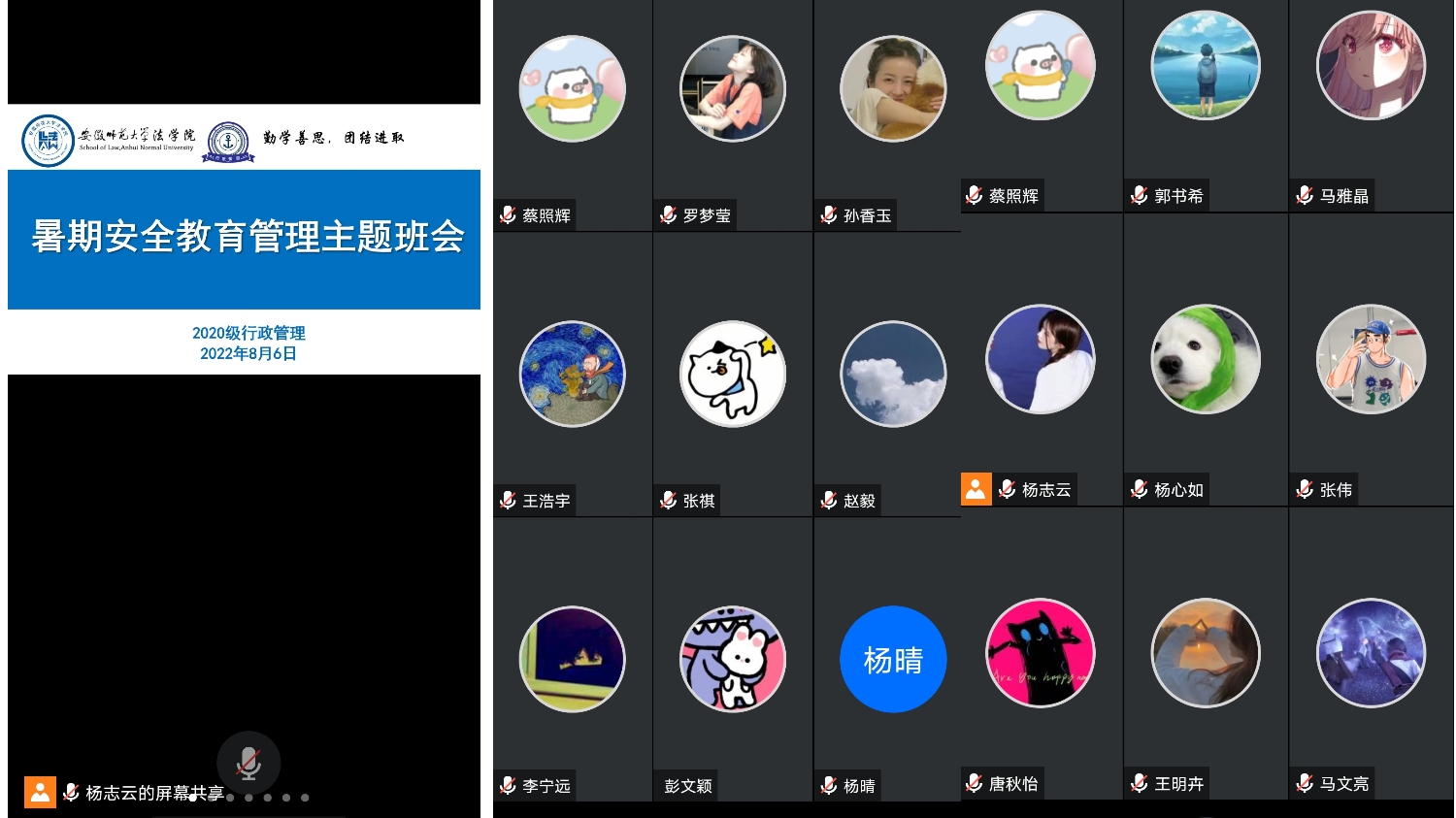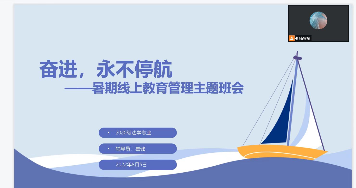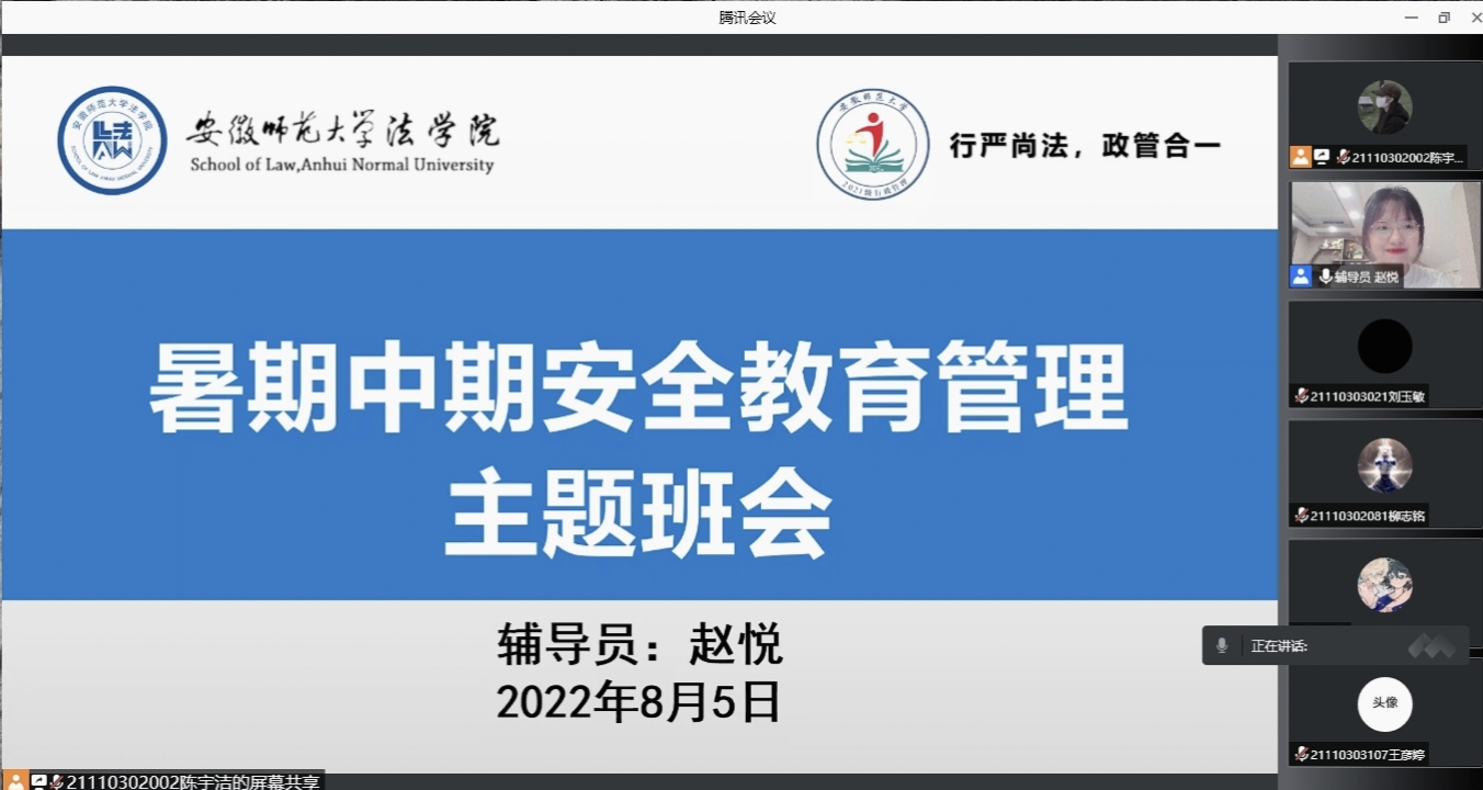 本网讯(36365线路检测中心 赵悦 李宇欣)暑假已过半,安全不放假。暑期是各类安全问题的易发多发期,为加强暑期留校和居家学生安全教育管理,8月初,36365线路检测中心各班级辅导员主持召开线上主题班会,开展暑期中期学生安全教育管理。