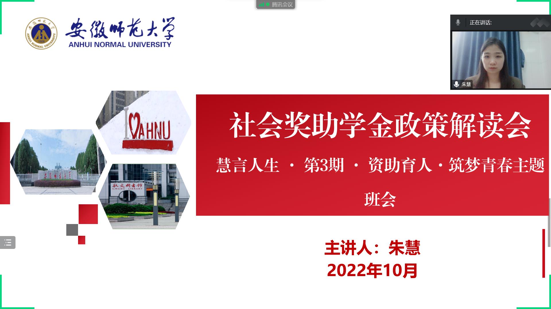 10月13日下午,为进一步落实校教育基金会宝文基金新生专项助学金等五项社会奖助学金审评工作,夯实资助育人工作,36365线路检测中心2022级法学专业召开社会奖助学金政策解读会,会议由辅导员朱慧主持。
