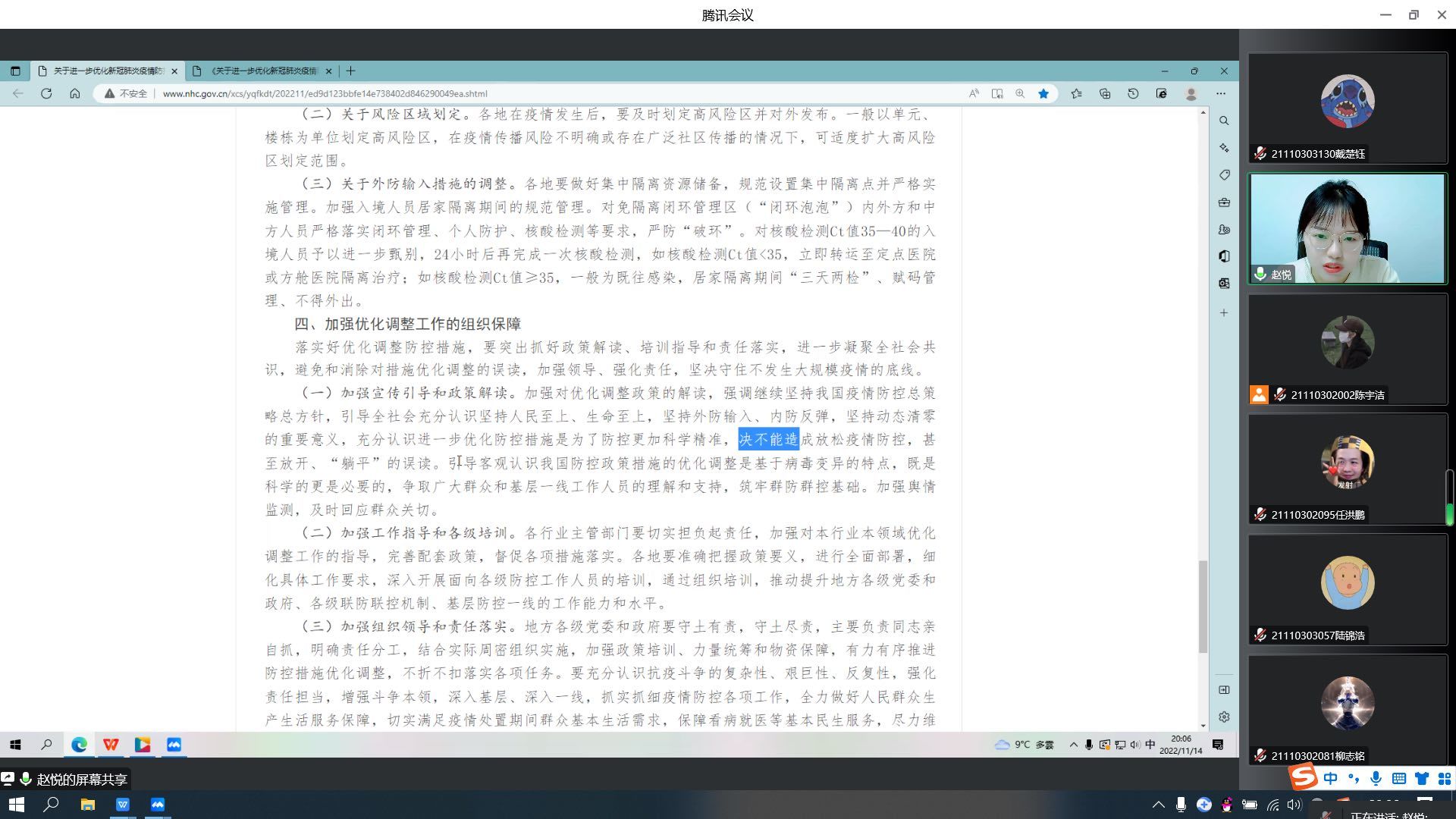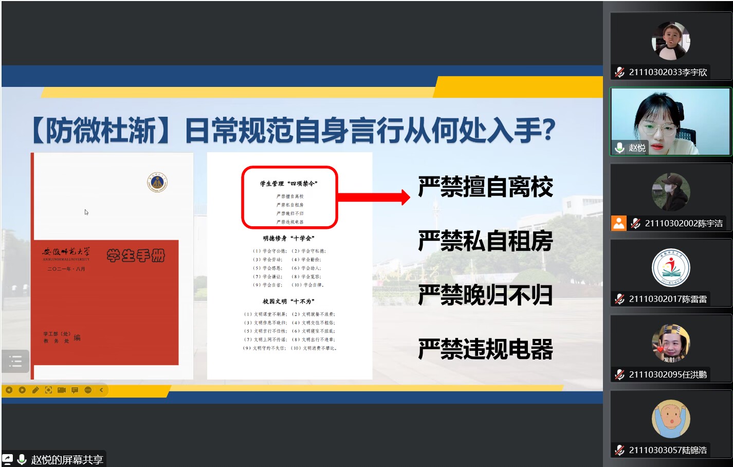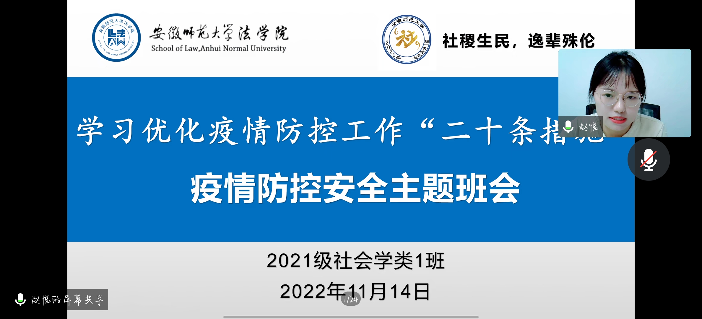 本网讯(36365线路检测中心 赵悦 汪兆舸)为严格落实新一轮疫情防控要求,11月14日晚,2021级社会学类线上召开疫情防控安全主题班会。班会由辅导员赵悦主持,2021级社会学类全体学生参加。