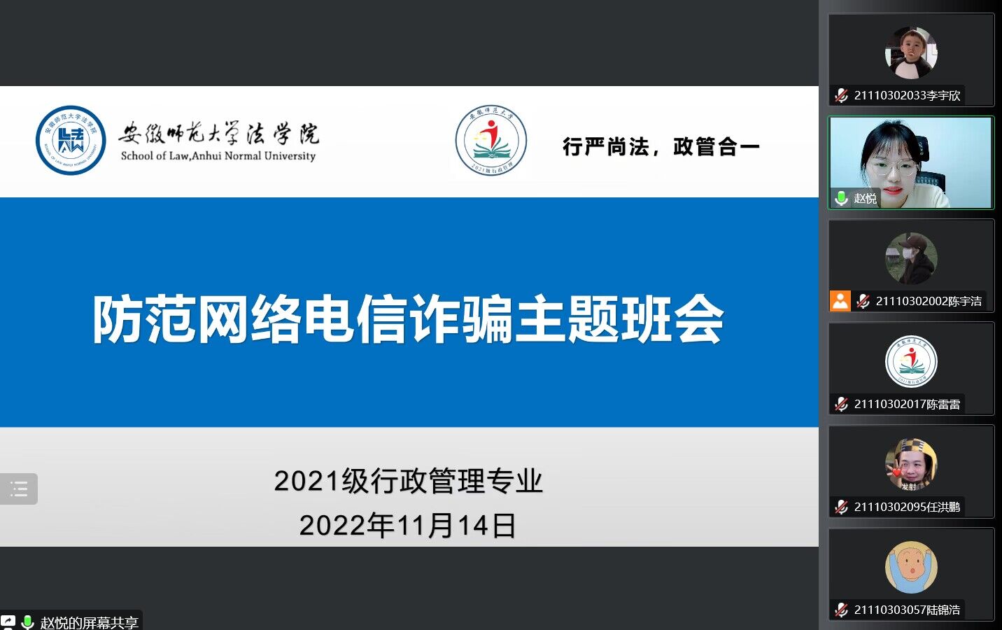 本网讯(36365线路检测中心 赵悦 李宇欣)为进一步加大防范电信网络诈骗的宣传力度,有效提高同学们“双十一”期间对电信诈骗的识别和应对能力,切实维护同学们的生命财产安全,11月14日,2021级行政管理专业召开防范网络电信诈骗主题班会。班会由辅导员赵悦主持,2021级行政管理专业全体同学参加。