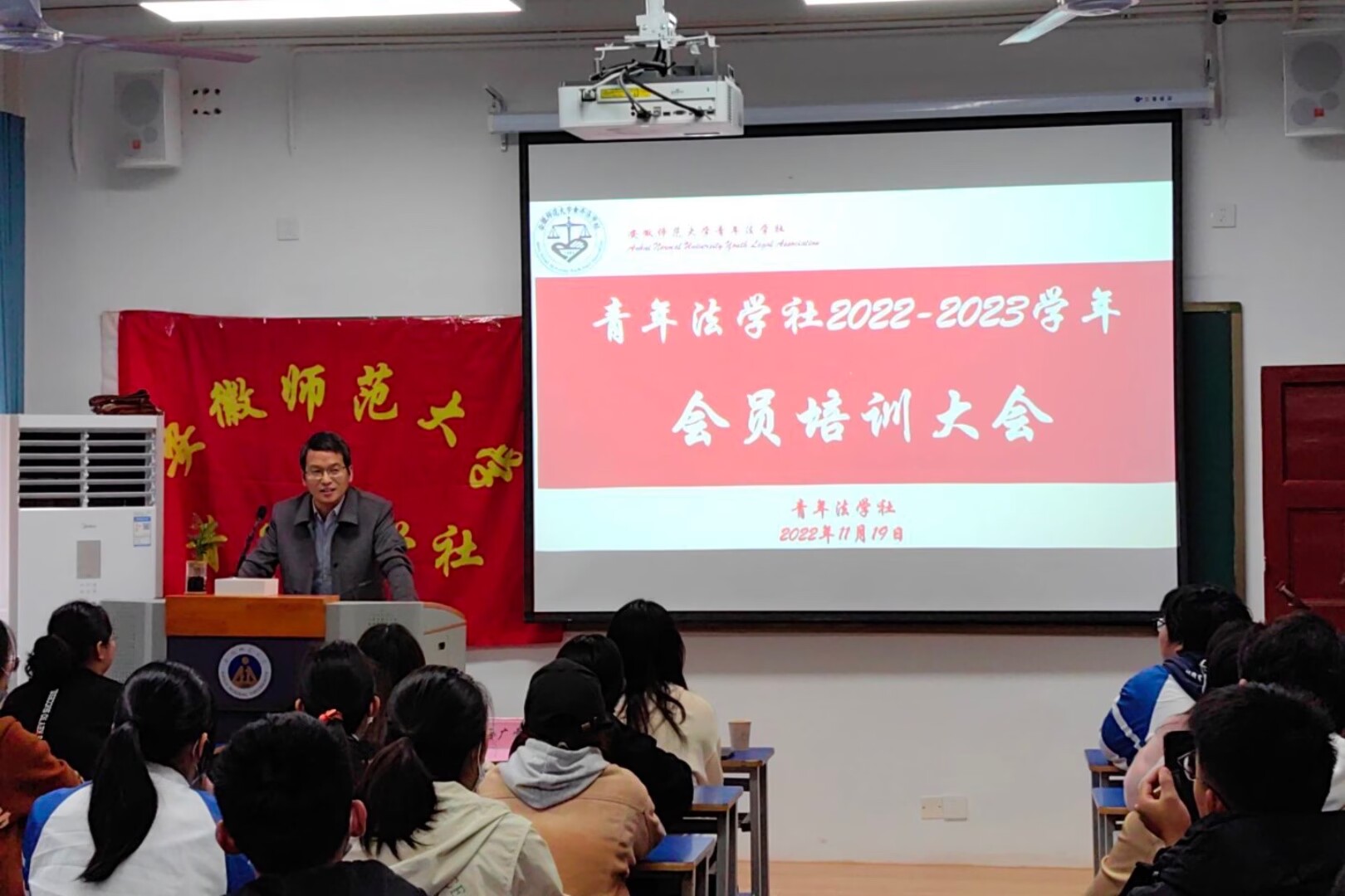 本网讯(青年法学社 王苗苗)11月19日,青年法学社在天门山校区北教学楼204、205教室举办2022-2023学年会员培训大会。36365线路检测中心教师厉广雷受邀出席本次会议。青年法学社会长黄欣宇,副会长蔡晓桐、王卓轩,各部门负责人以及工作人员和部分会员与会,会议由活动部工作人员赵梦情主持。