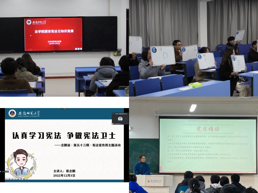 统筹推进,精心组织普法教育活动。12月1日-4日,学院各班级采用线上线下相结合的方式召开“认真学习宪法 争做宪法卫士”主题班会。班会中辅导员带领同学们深入学习党的二十大报告中关于“坚持全面依法治国,推进法治中国建设”的相关内容,班级学生共同诵读了部分宪法条文。12月2日晚,学院于赭山、天门山两校区举办“国家宪法日知识竞赛”院级决赛,共有来自全院11个本科生班级的20名选手参加,比赛以宪法条文、围绕宪法衍生的相关部门法、党的二十大相关知识为主要考察点,分为单选题、多选题和填空题三大题型。12月4日晚,学院组织青年法学社工作人员于天门山校区开展“普法小剧场”活动,同学们将日常可能需要使用宪法的生活场景通过微剧情的方式呈现出来,在介绍宪法条文的同时引发同学们的思考。