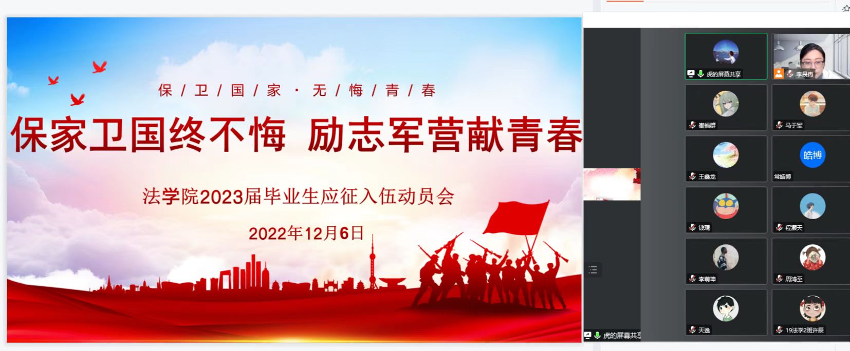 本网讯( 李晨冉/徐欢忠)“保家卫国终不悔,励志军营献青春”。为激发大学生家国情怀,增强学生投身国防意识,鼓励大学生积极应征入伍,提高兵员征集质量,推进国防和军队现代化建设与发展。12月6日下午,36365官网召开2023届毕业班应征入伍动员会。会议由毕业班辅导员李晨冉主持,退伍大学生姚俊虎、刘辰子、张浩玮做汇报,2019级毕业班全体学生参加。