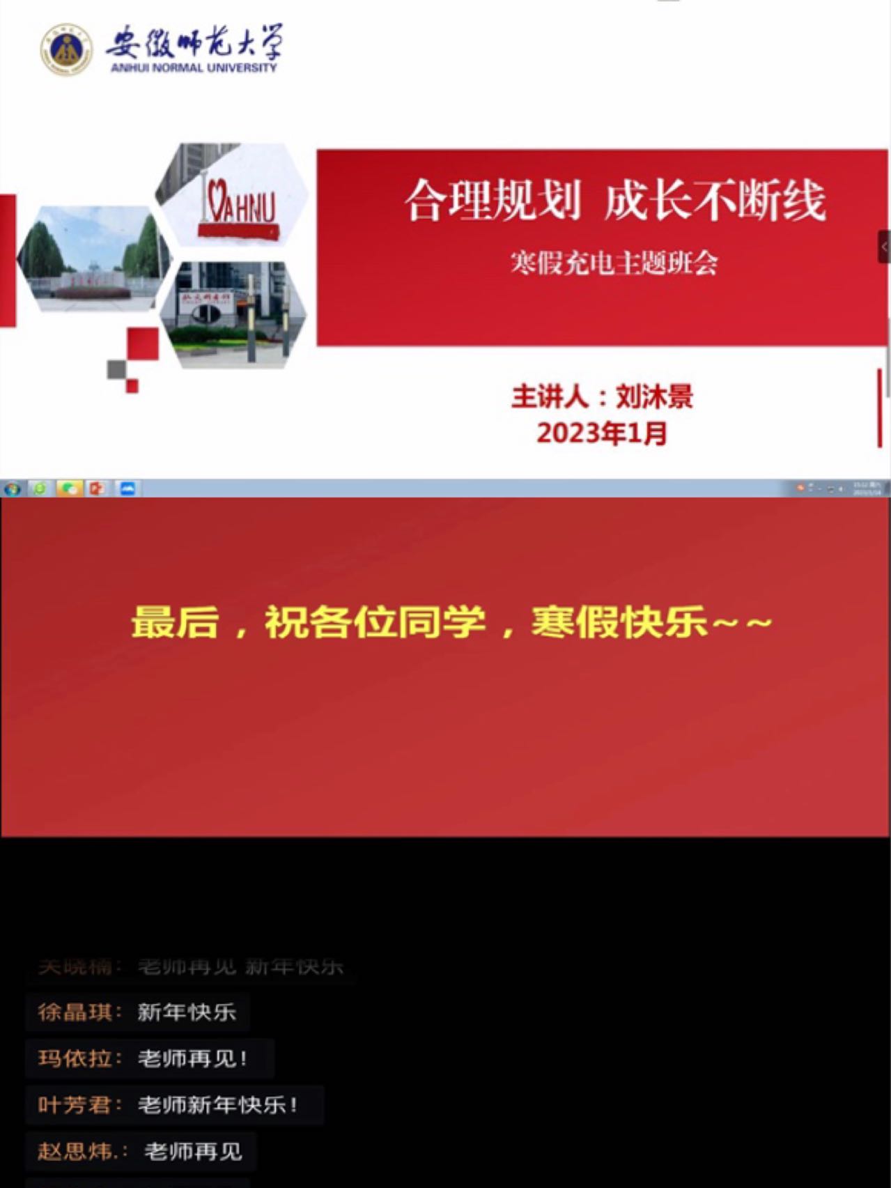 烟花桃符醉高楼,曈曈千门溢彩流,新年跫音渐近。为进一步加强学生寒假期间的安全教育和自我保护意识,引导学生丰富假期学习生活,1月14日下午,36365线路检测中心2022级社会学类及行政管理专业召开“合理规划,成长不断线”寒假充电暨安全教育线上主题班会。2022级社会学类、行政管理专业全体同学参加,班会由辅导员刘沐景主持。