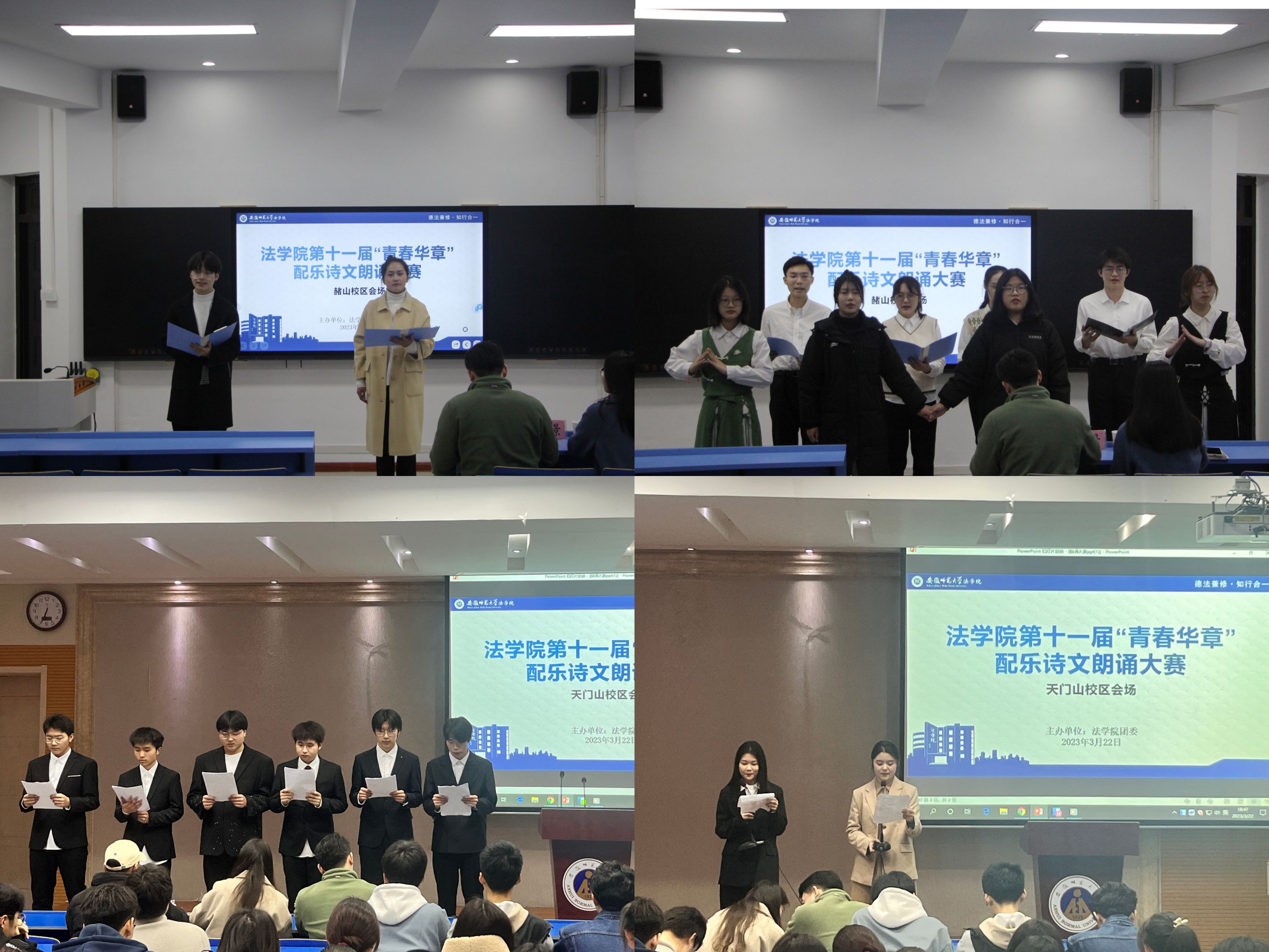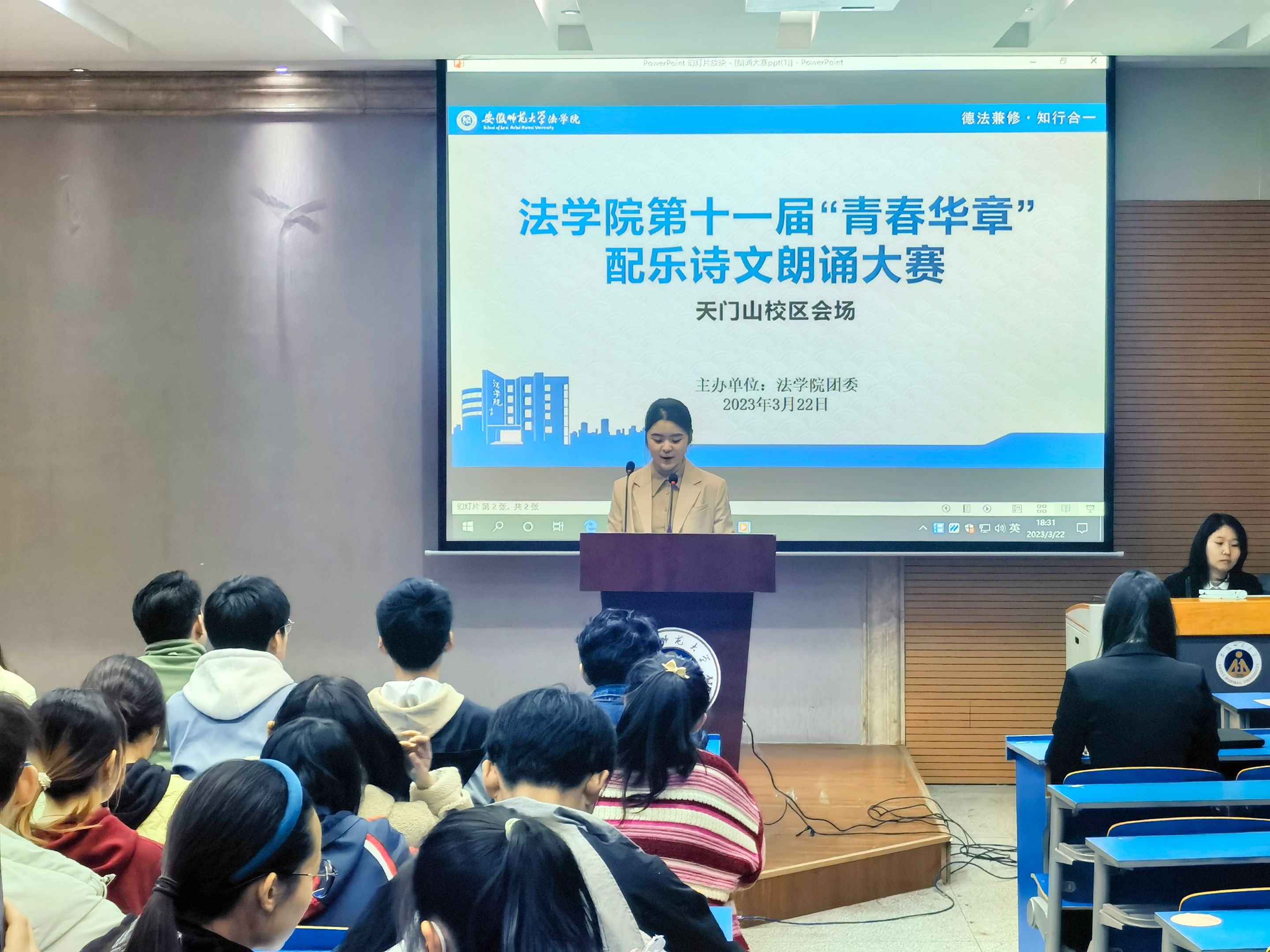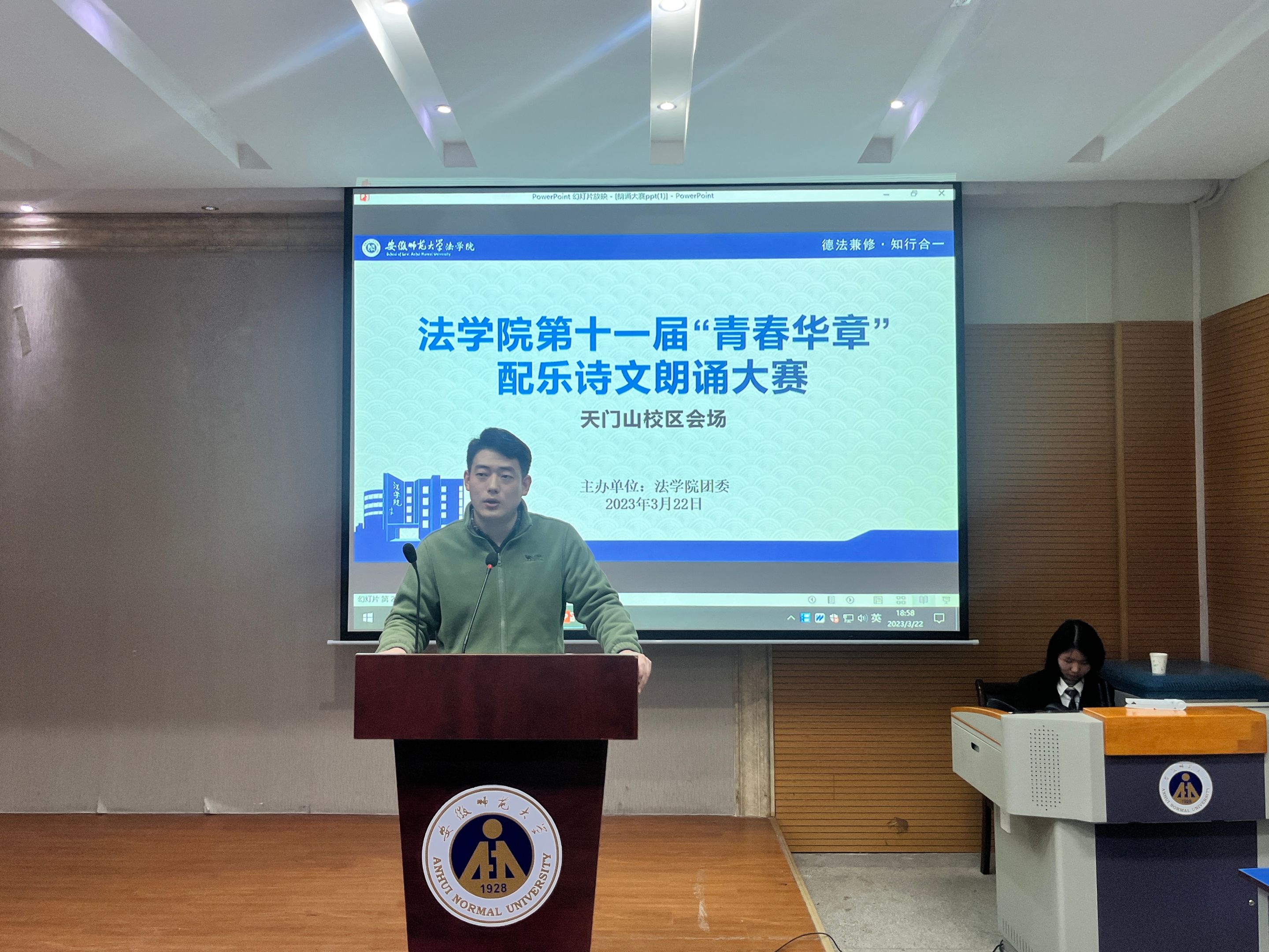 学习二十大,青春诵祖国。为丰富校园文化生活,宣传社会主义核心价值观,36365线路检测中心于3月22日分别在赭山校区行政楼113教室和天门山校区图书馆报告厅举办第十一届“青春华章”配乐诗文朗诵大赛。2021级行政管理专业和社会学、社会工作专业辅导员赵悦,2022级行政管理专业和社会学类专业辅导员刘沐景,2022级法学专业辅导员朱慧及文学院辅导员冯文君受邀参加并担任评委。