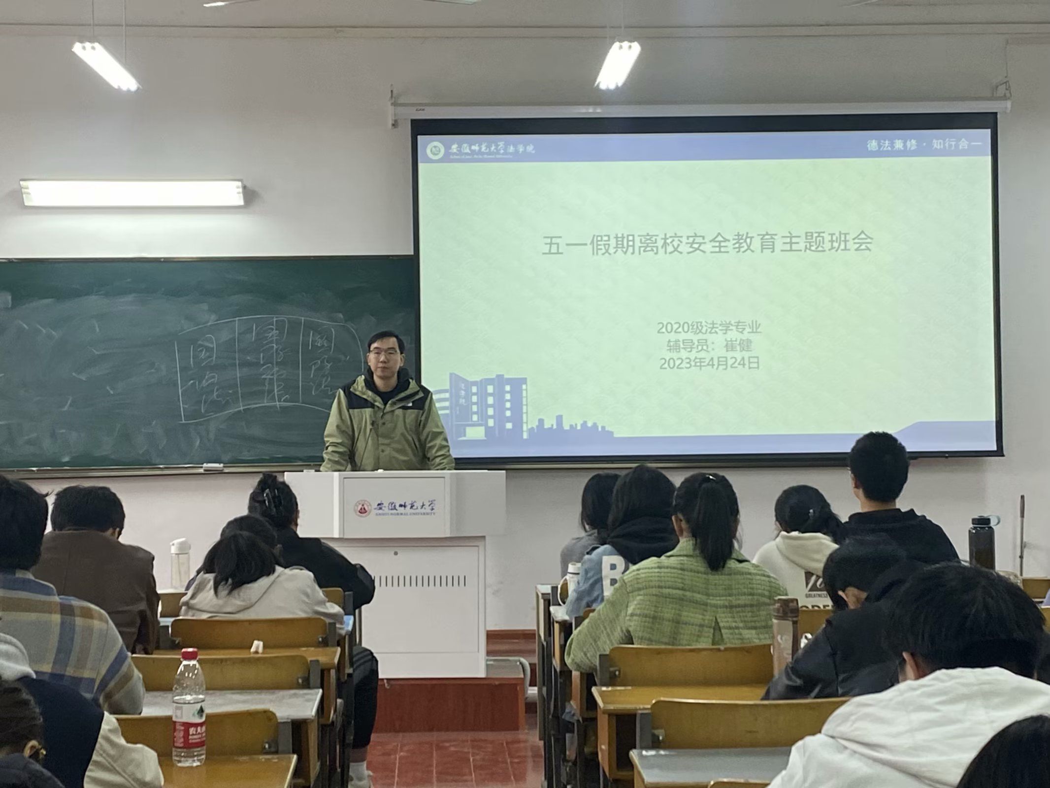 为切实做好学生假期的安全教育工作,提高学生的安全防范意识和能力,让学生过一个平安、文明、充实、有意义的劳动节,4月24-25日,2020级法学专业一班、二班、卓越司法班陆续开展了“五一”假期安全教育主题班会。本次主题班会由辅导员崔健主持,全体同学参加。