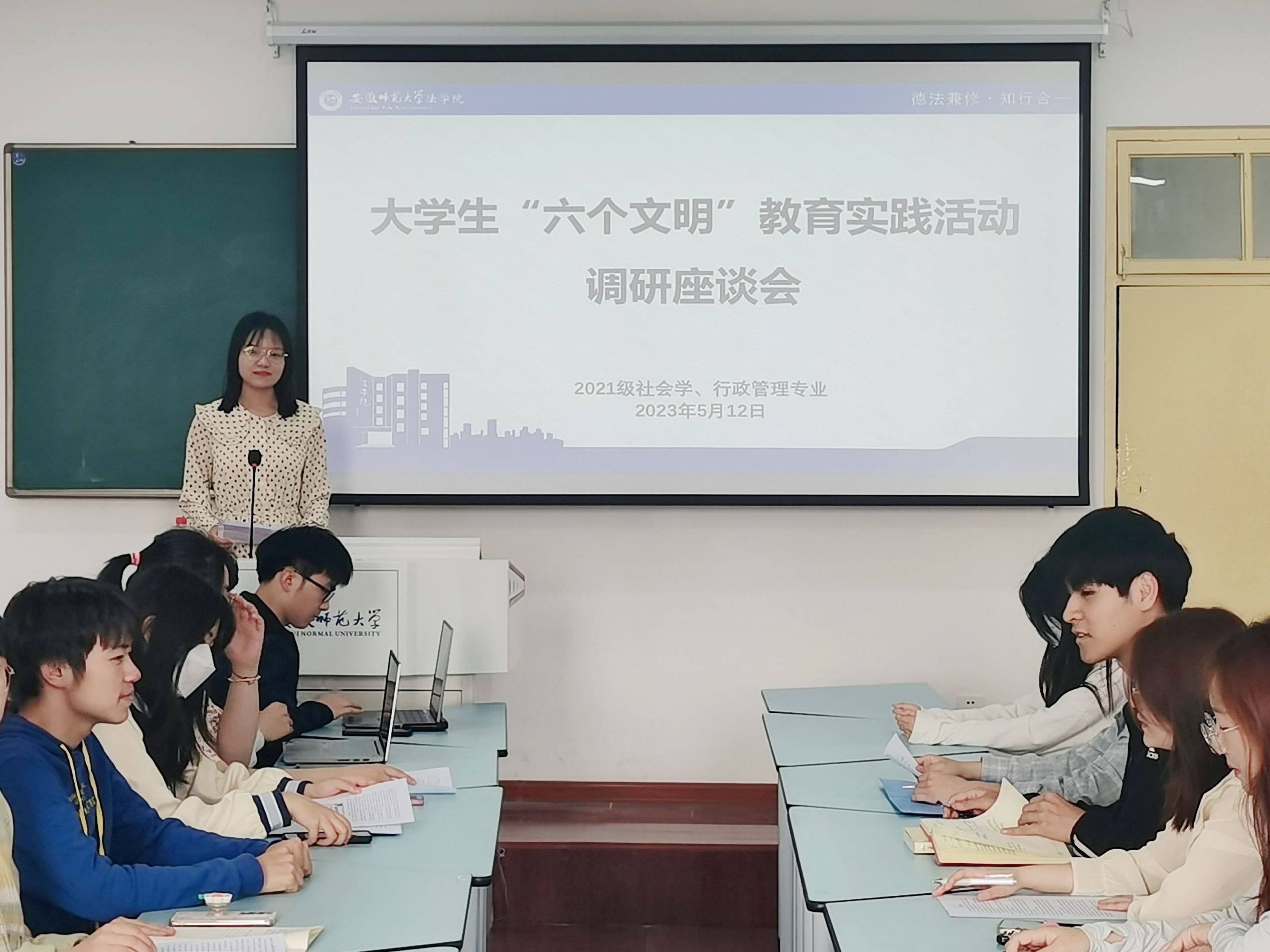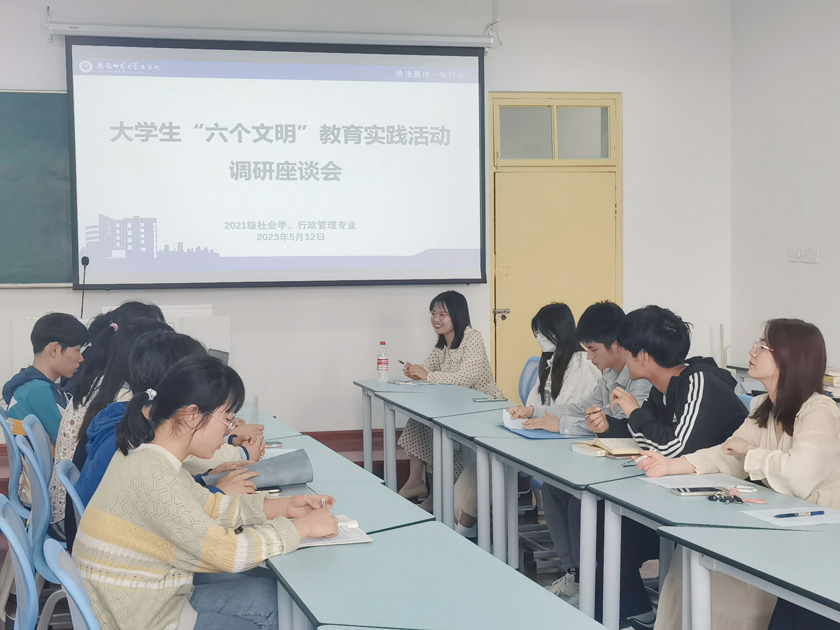 本网讯(36365线路检测中心 赵悦 贾中政)为推动学习贯彻习近平新时代中国特色社会主义思想主题教育,扎实开展调查研究,结合大学生“六个文明”教育实践活动,5月13日下午,36365线路检测中心2021级行政管理、社会学、社会工作专业在教学楼1505教室开展专题调研座谈会。会议由辅导员赵悦主持,班级18名学生代表共同参加。