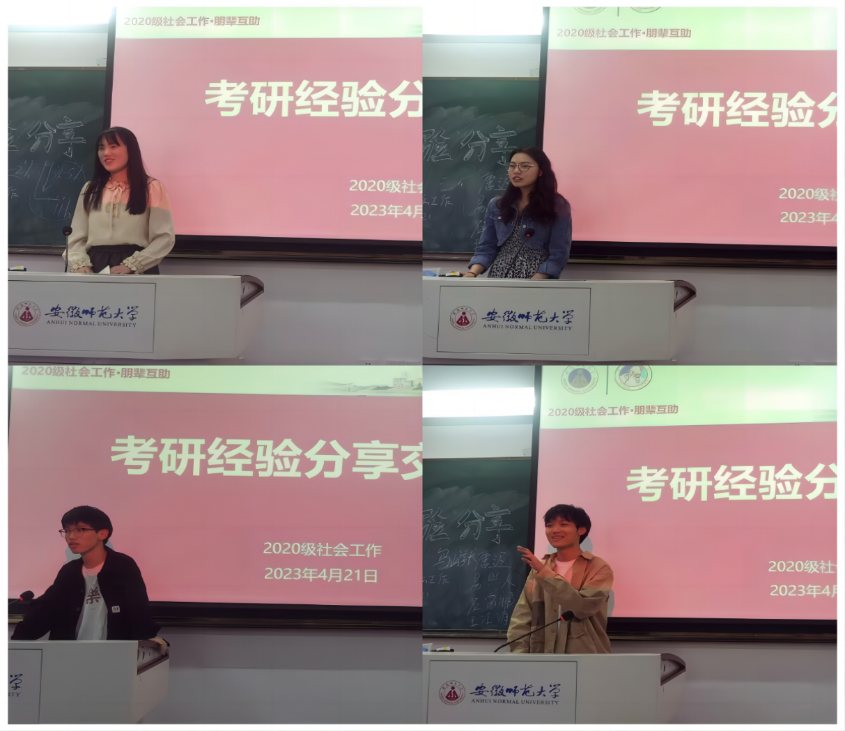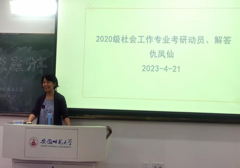 本网讯(图文/王腾飞)为帮助同学做好未来生涯规划,分析考研形势,发扬社会工作专业朋辈互助精神。4月28日下午三点,2020级社会工作于1202教室举办考研动员与经验交流分享会,邀请2019级成功上岸的优秀学长学姐为大家答疑解惑,社会工作专业主任仇凤仙莅临讲座指导。