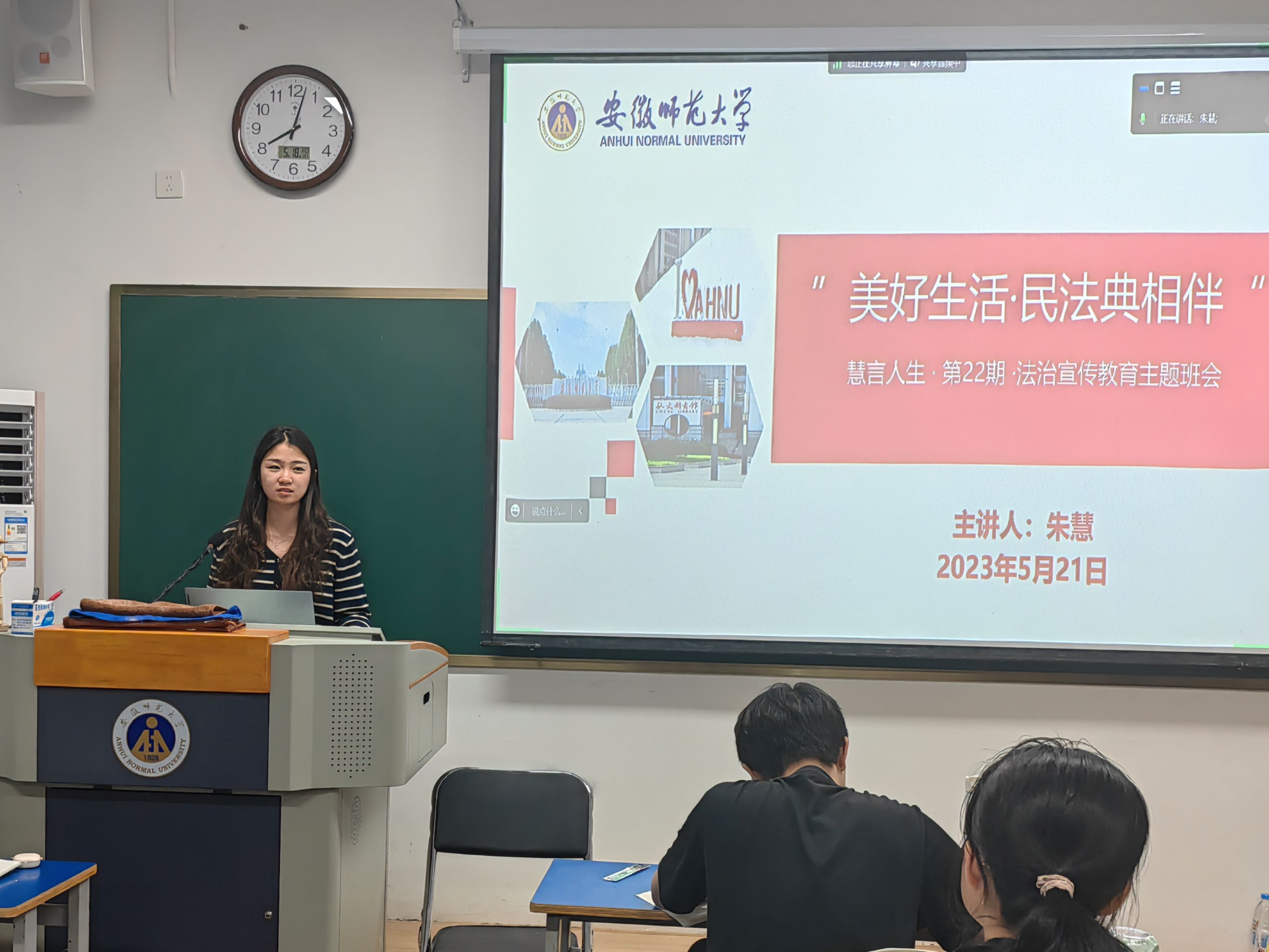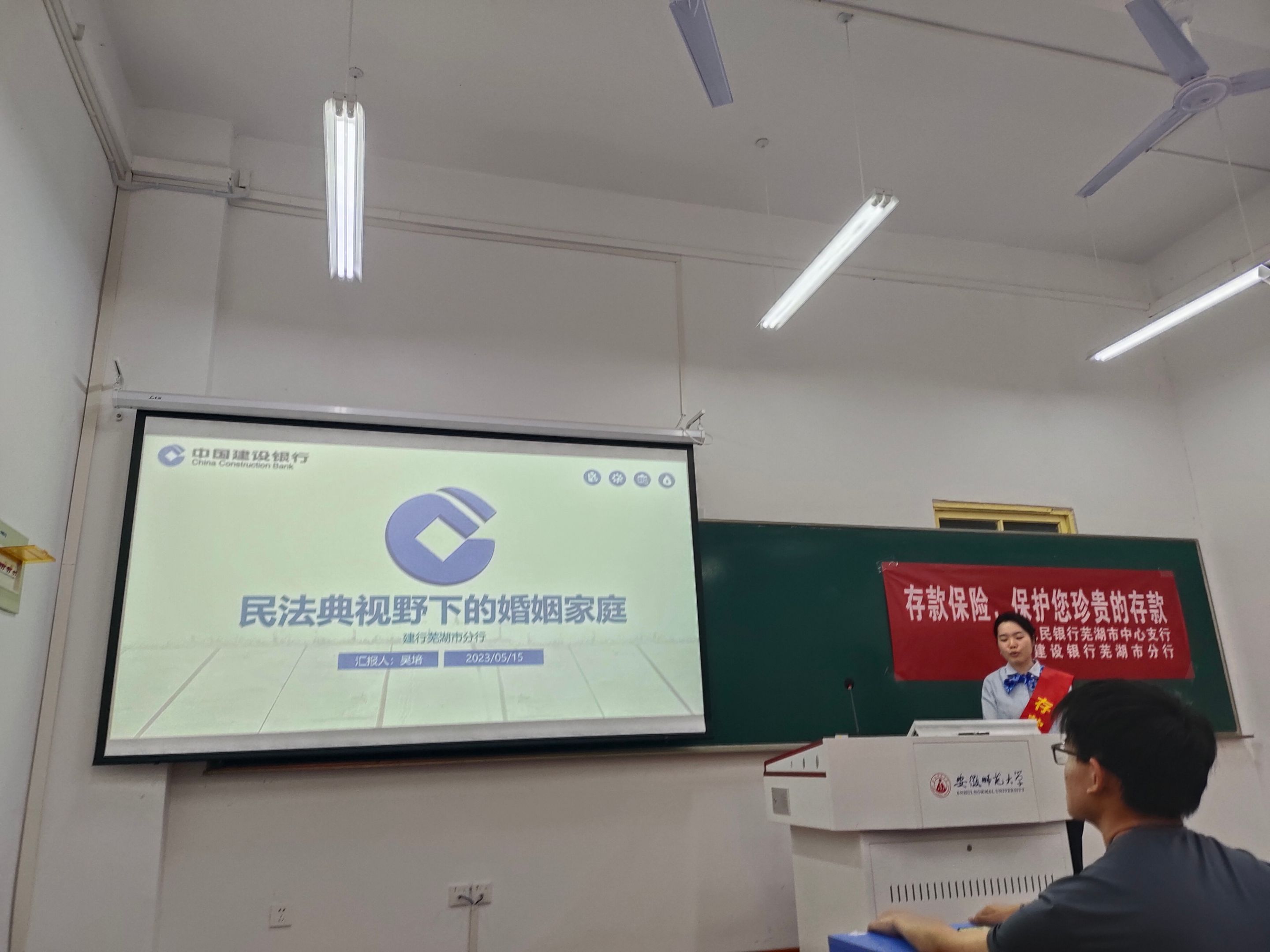 校内与校外相结合,合力联动切实推进民法典宣传。2021级行政管理、社会学专业辅导员赵悦邀请中国人民银行芜湖市中心支行靳先好科长和中国建设银行芜湖市分行副行长刘夏一行工作人员为2021级行政管理专业学生开展专题讲座。宣讲员为同学们进行了存款保险知识宣讲。通过播放存款保险视频、讲解现实案例等方式,解答存款保险的定义、保障范围、偿付限额等问题。结合民法典中关于婚姻家庭的具体条例,宣讲员介绍了四条婚姻家庭编要点,进一步增强大家的法律意识。