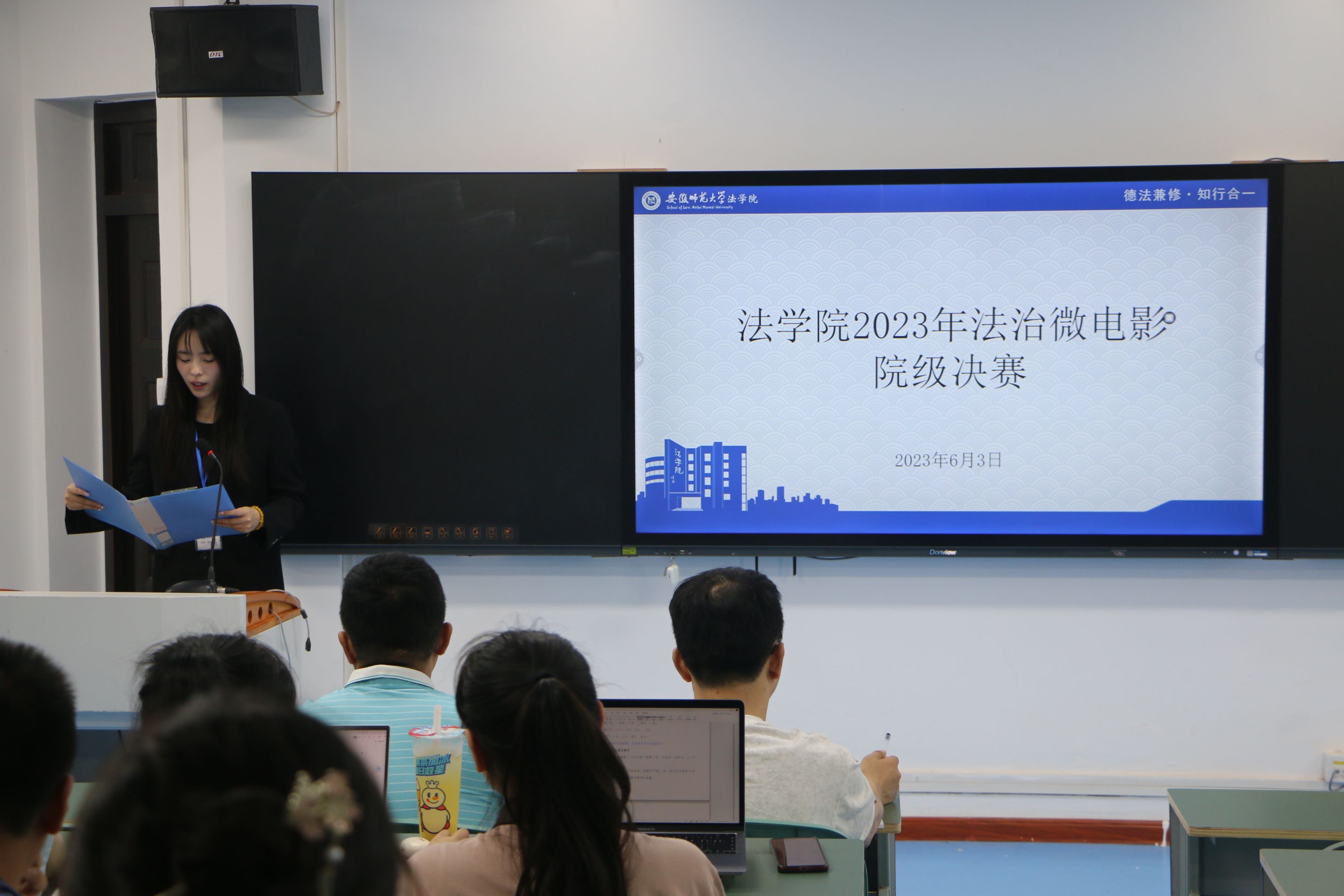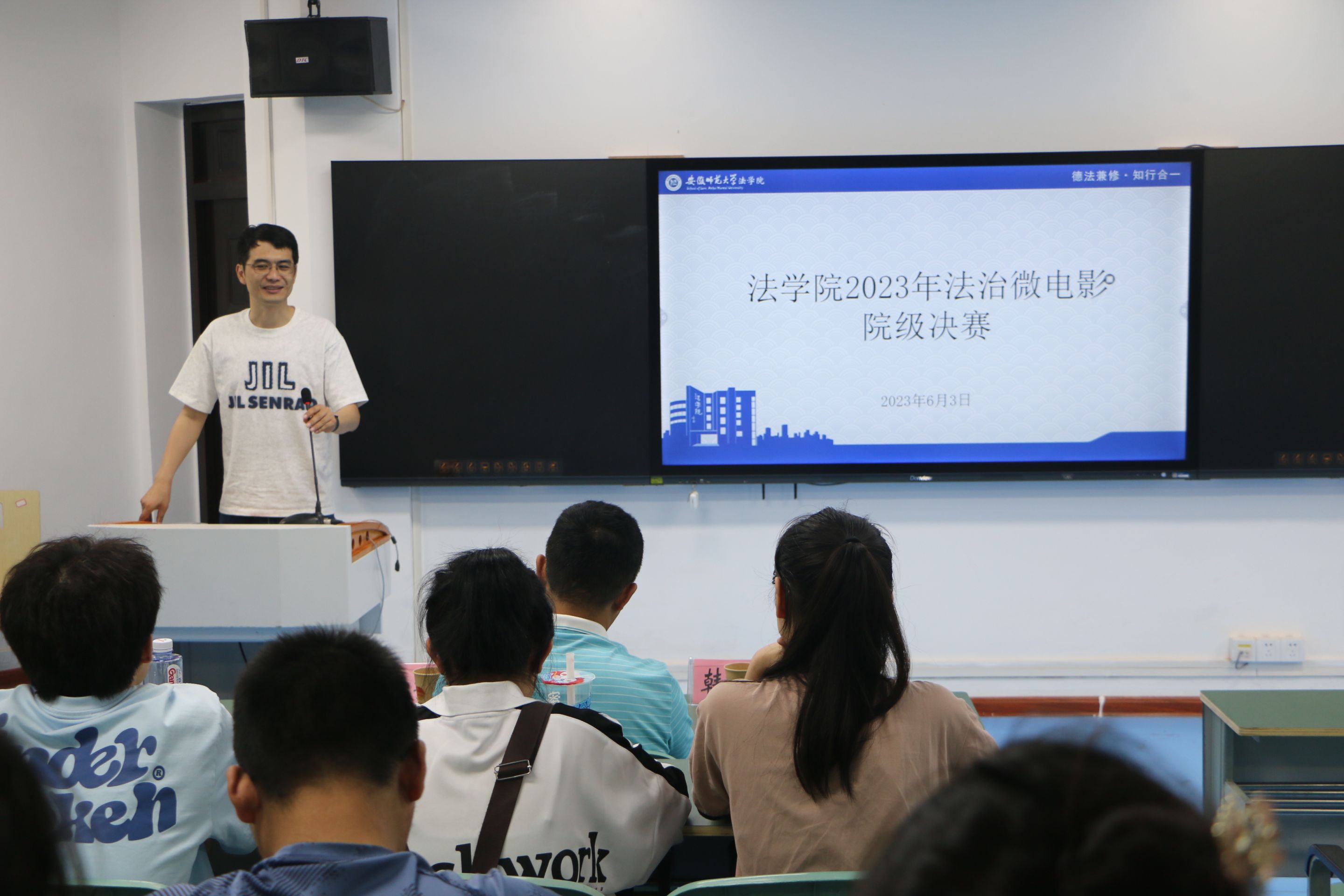 经过第一轮报名和评选,共有八份作品进入决赛。此次大赛以“法治初心,勇担使命”为主题,八份作品依次播放。每部作品都主题鲜明,以法学专业学生的视角展现制片人对于社会热点和日常生活的思考。《“贷”价》警示大学生远离校园贷;《让法治守护头顶上的安全》讲述有关高空抛物的故事;《网》聚焦生活中的网络暴力,提醒同学们学会运用法律武器保护自己的合法权益;《余温》强调司法工作者不能只是钻研法律条文,而是要扎根基层,深入到人民群众内部,真正做到以人民为中心;《初心》讲述初心不改,廉洁司法的故事;《三顾骗局》通过对反诈故事的讲述,警醒人们增强防范意识;《成年人》展现当今青年的迷茫、思考与成长;《新“拐”》介绍近些年新型拐骗手法,提醒我们增强对于此类事件的警惕意识。