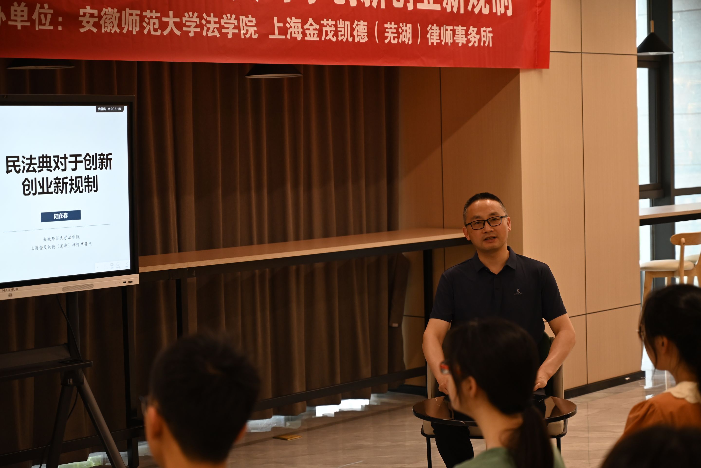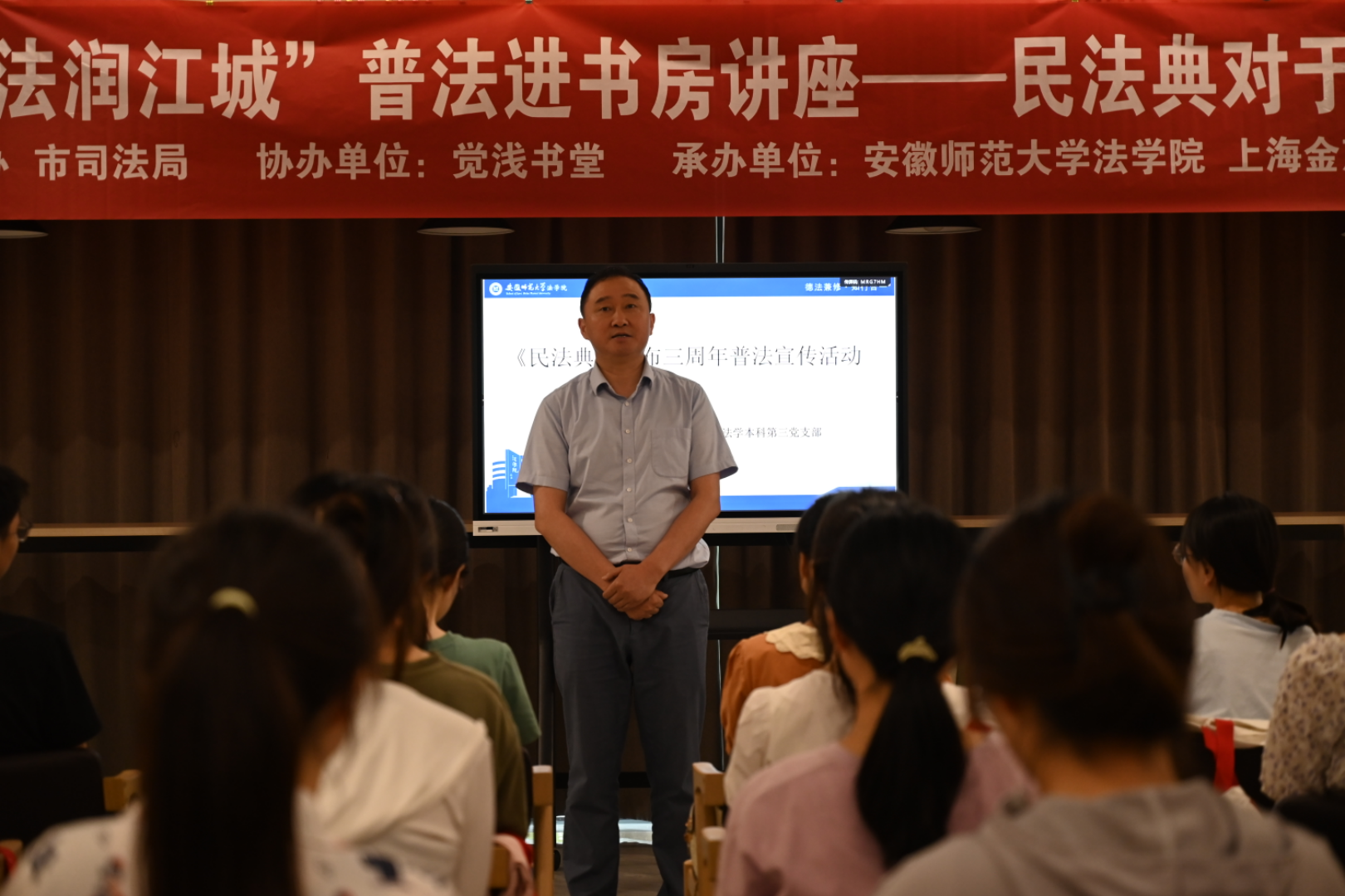 活动中,市司法局普法与依法治理科科长朱红兵介绍了本次活动的背景与意义,鼓励同学们积极参与普法活动,切实推动《民法典》在高校间的宣传普及。随后,学院法学专业教师陆在春围绕《民法典》的结构及主要内容及《民法典》的要点热点等进行分析。陆老师的讲授思路清晰、旁征博引,深入浅出,既有理论概括,又有实践内涵,对深入理解、准确把握《民法典》的精神要义、基本原则、条文规范,具有现实意义和指导意义。