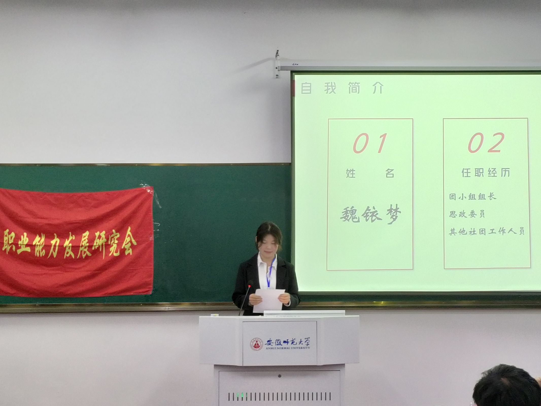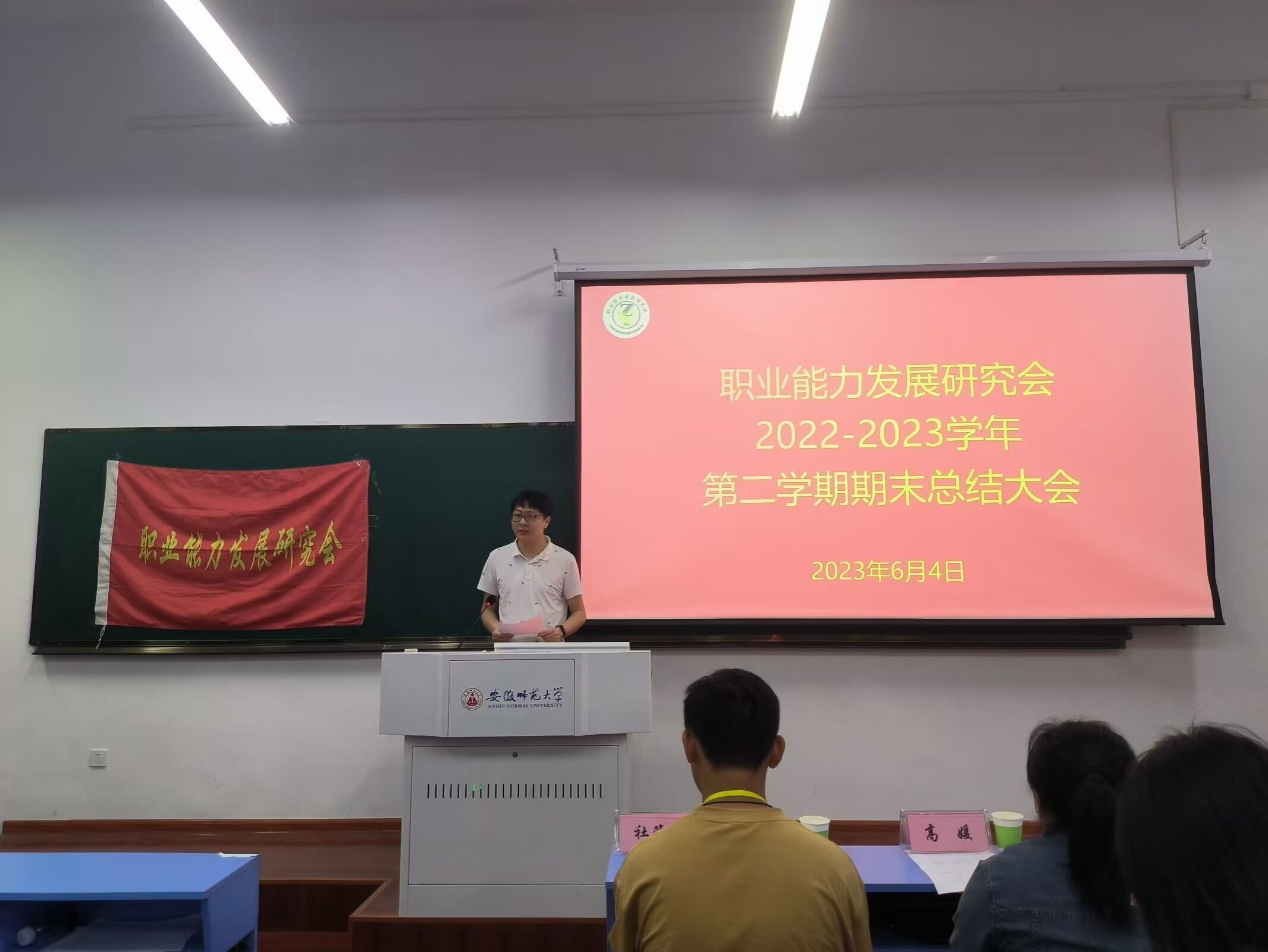 本网讯(职业能力发展研究会 武剑豪)6月4日,职业能力发展研究会在赭山校区教学楼1108教室举办2022-2023学年第二学期期末总结大会暨十佳工作人员竞选。职业能力发展研究会会长高媛、各部门负责人及其他学生工作人员参与了此次大会。会议由综合部工作人员胡世坤主持。