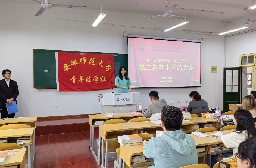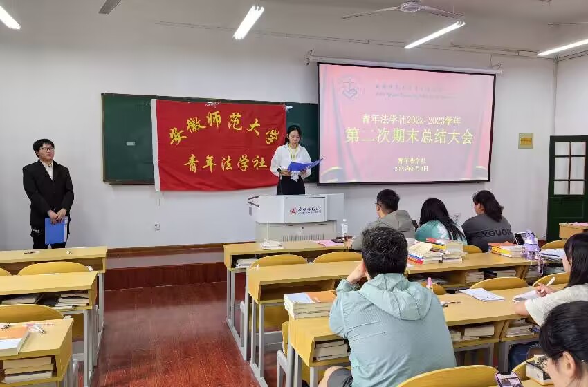 本网讯(青年法学社 田维阳)6月4日下午,青年法学社在赭山校区教学楼1502教室召开了2022-2023学年第二学期期末总结大会。青年法学社会长黄欣宇,副会长蔡晓桐、王卓轩出席本次会议,各部门部长及工作人员与会,会议由活动部工作人员魏子轩主持。