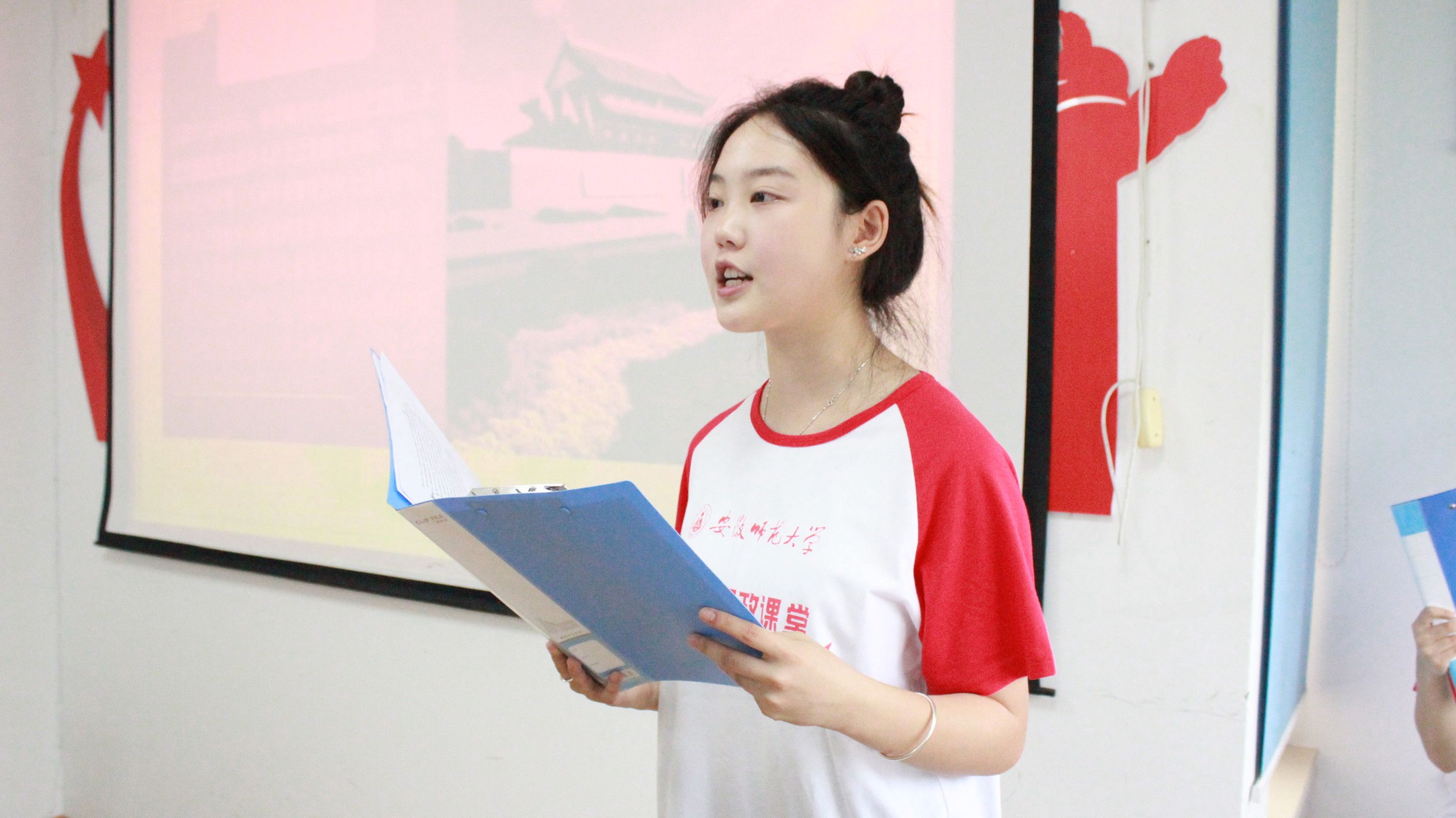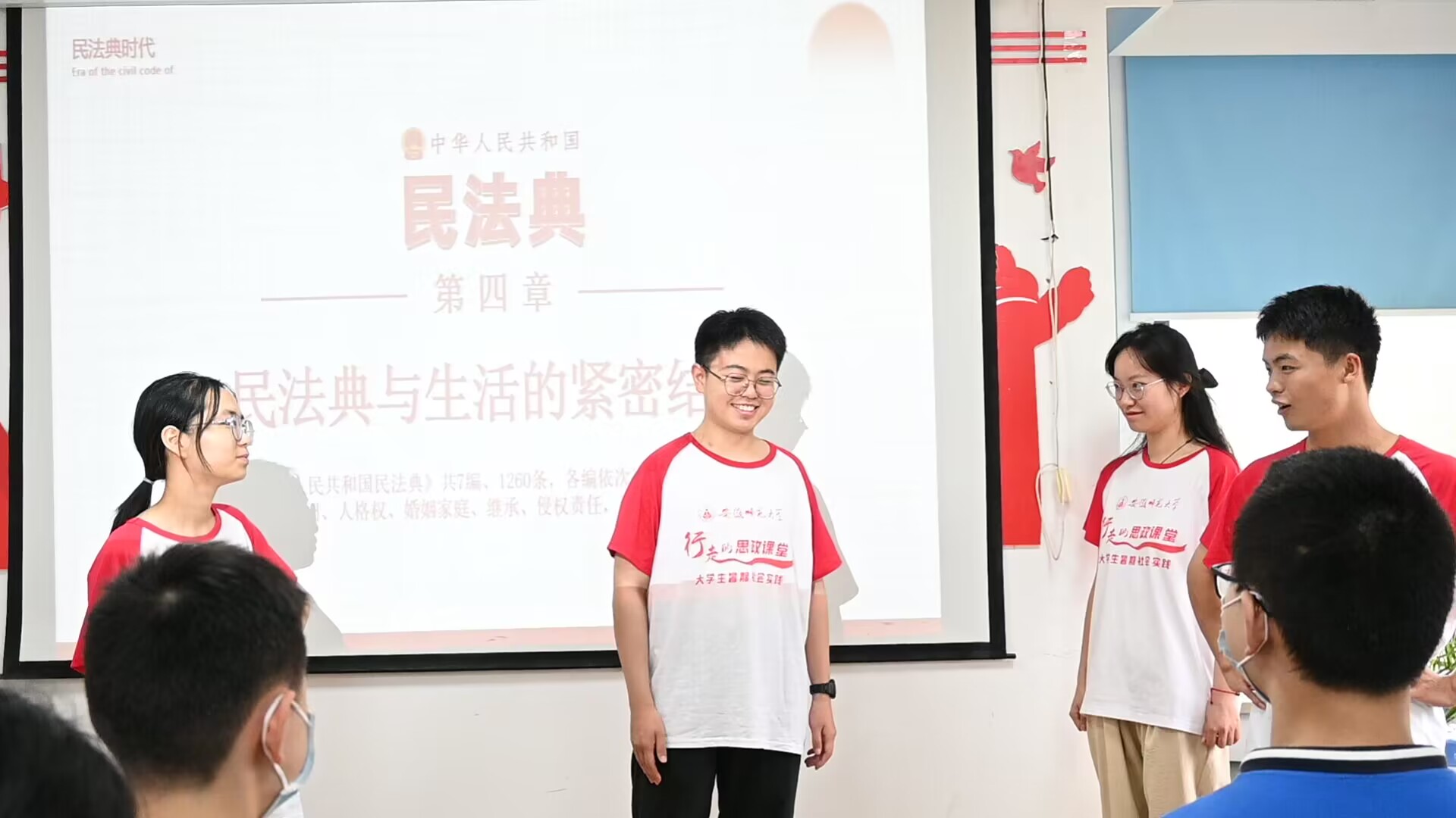 “行走的思政课”——大学生骨干宣讲团宣讲员张梦晴为大家宣讲《法治中国行—学习贯彻习近平法治思想,续写绚烂华章》,她从“重要战略地位、核心要义‘十一个坚持’、建设高水平法治中国”三个角度为大家普及习近平法治思想。她围绕习近平法治思想在社会体系建设中所取得的辉煌成就,以此坚定法治自信,走中国特色社会主义法治道路。