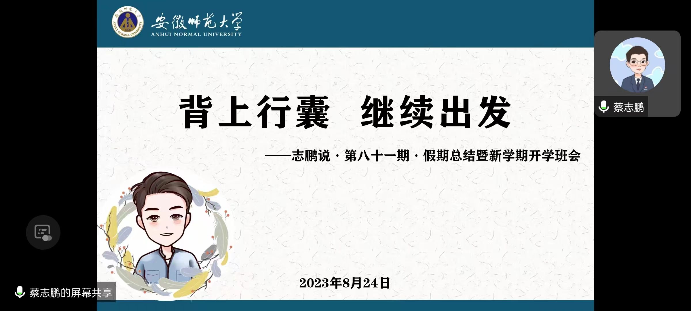 会议中,蔡志鹏老师首先对即将返校的同学们表示欢迎,并要求同学们注意人身和经济安全,谨网络防电信诈骗。其后他对同学们从注重“两张表”、做好“两规划”出发,提醒同学们对自身学习做到查缺补漏,注意学校的选课安排和应修学分,做到不少修、不漏修;他要求同学们要做好学期规划和生涯规划,注重自身学术经历的丰富和实践能力的锻炼,做好最适合自身发展的生涯规划。最后,蔡志鹏希望同学们不要虚度光阴,努力拼搏,用自己的勤奋与智慧书写新的篇章!