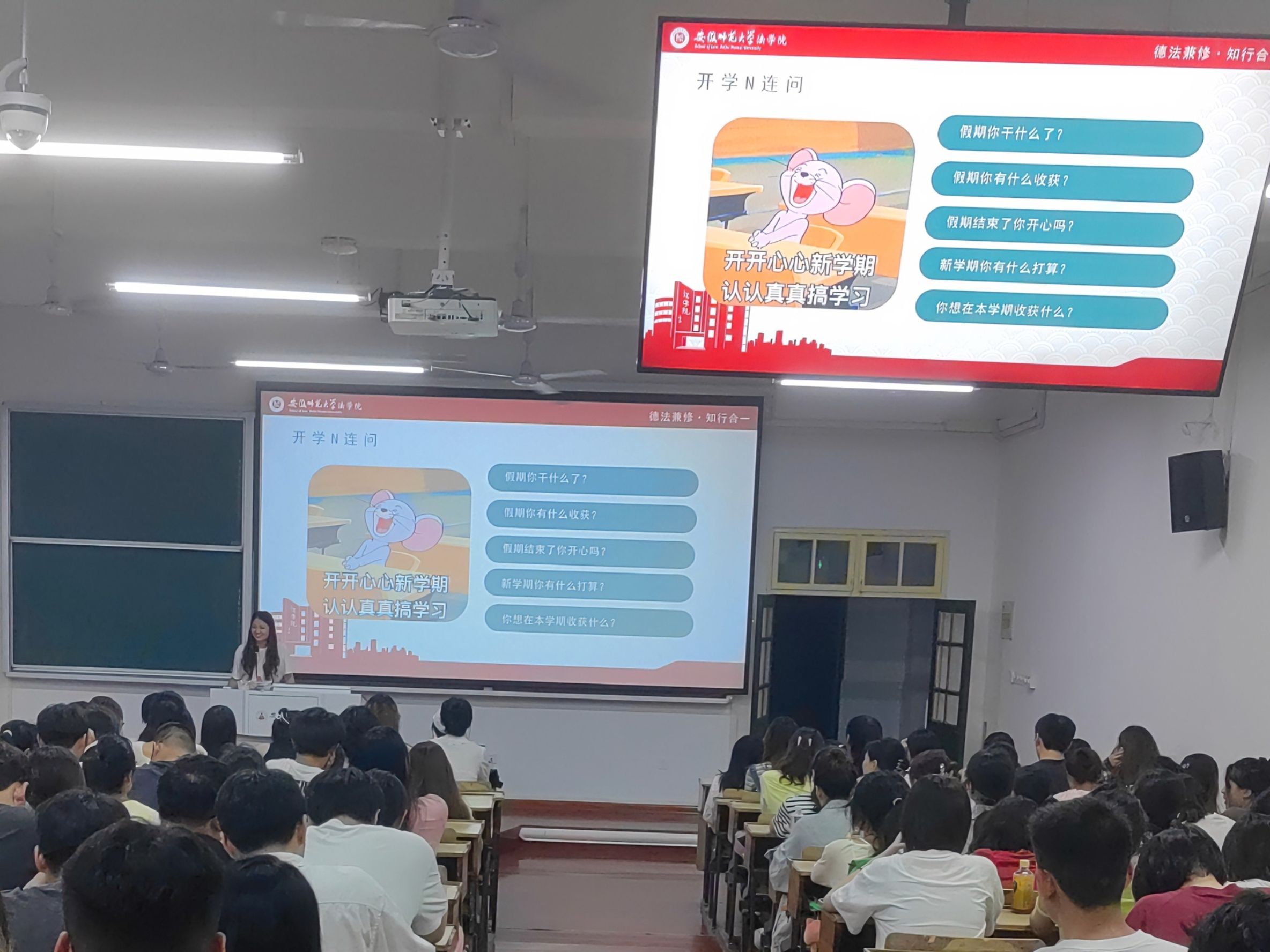 朱慧以“开学N连问”为切入点,提醒同学们可以从“调整作息,合理准备”“制定计划,合理准备”“产生一定的技能‘焦虑’”“制定一个小目标”等方面,治疗假期综合征,及时收心。朱慧表示,希望同学们能够克服惰性、学会自律,树立学习目标,同时,向上向善、勤勉自信,养成良好习惯,落实六个文明教育。此外,她从暑期大热电影《孤注一掷》入手,提醒同学们“预防电信诈骗五不要”和“防电信诈骗八守则”,共建平安无诈校园。