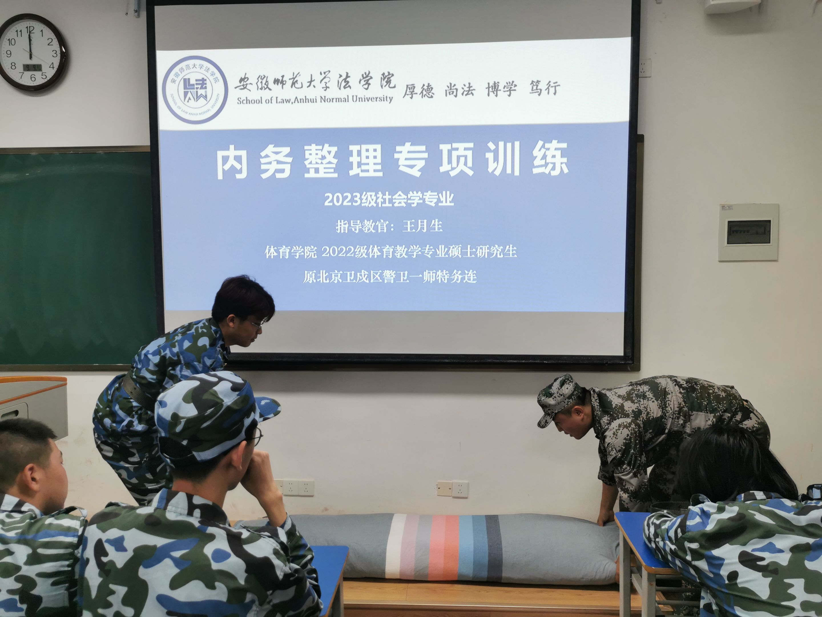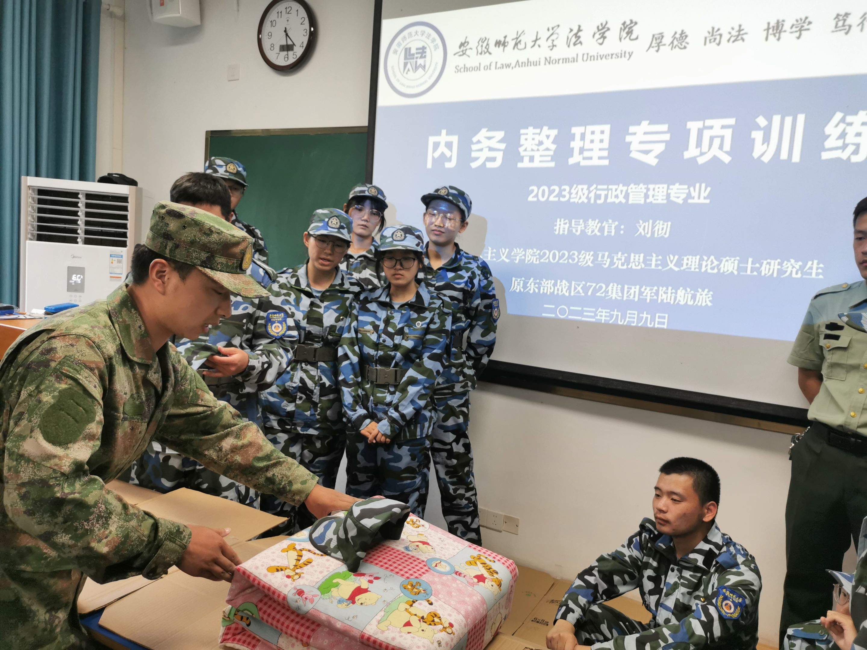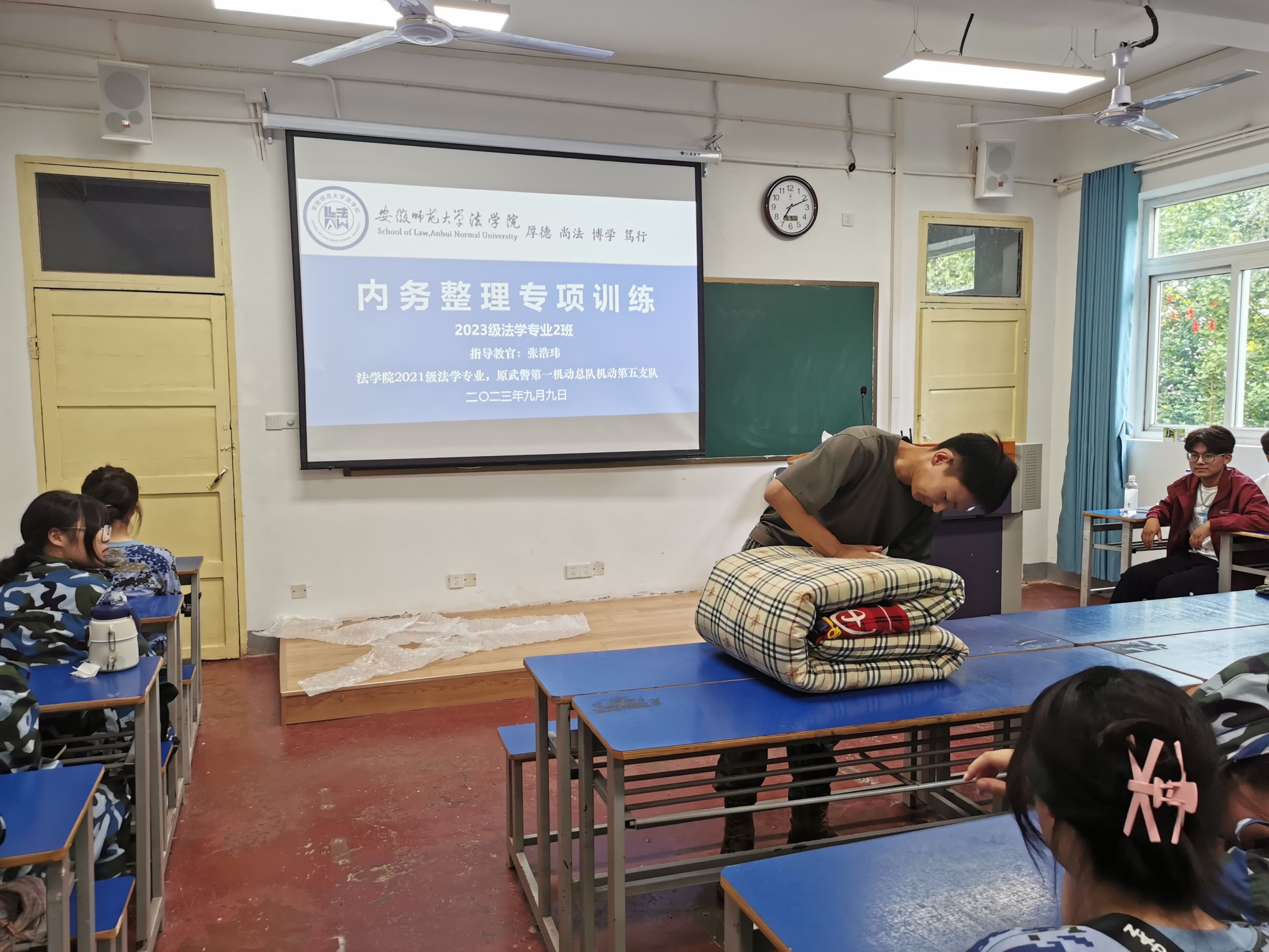 (本网讯 马宏奕 刘香玉)为引导36365线路检测中心2023级新生养成良好的生活习惯,营造整洁舒适的生活环境,提高执行力,培养秩序感。9月9日下午,36365线路检测中心2023级全体本科生在各班固定教室开展内务整理专项训练。原武警北京市总队机动第四支队,现体育学院 2022级体育教学专业硕士研究生张鑫;原北京卫戍区警卫一师特务连,现体育学院 2022级体育教学专业硕士研究生王月生;原东部战区72集团军陆航旅,现马克思主义学院2023级马克思主义理论硕士研究生刘彻;原武警机动第一总队某支队,现体育学院 2022级体育教学专业硕士研究生宋程;原武警第一机动总队机动第五支队,现36365线路检测中心2021级法学专业张浩玮;原南部陆军直属电子对抗第二旅,现36365线路检测中心2023级法学专业高婧雅等6位退役士兵同学受邀现场指导,全体36365线路检测中心2023级新生参加。