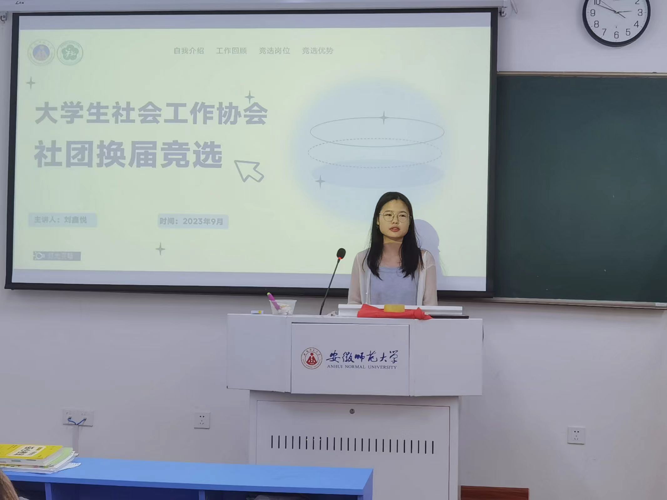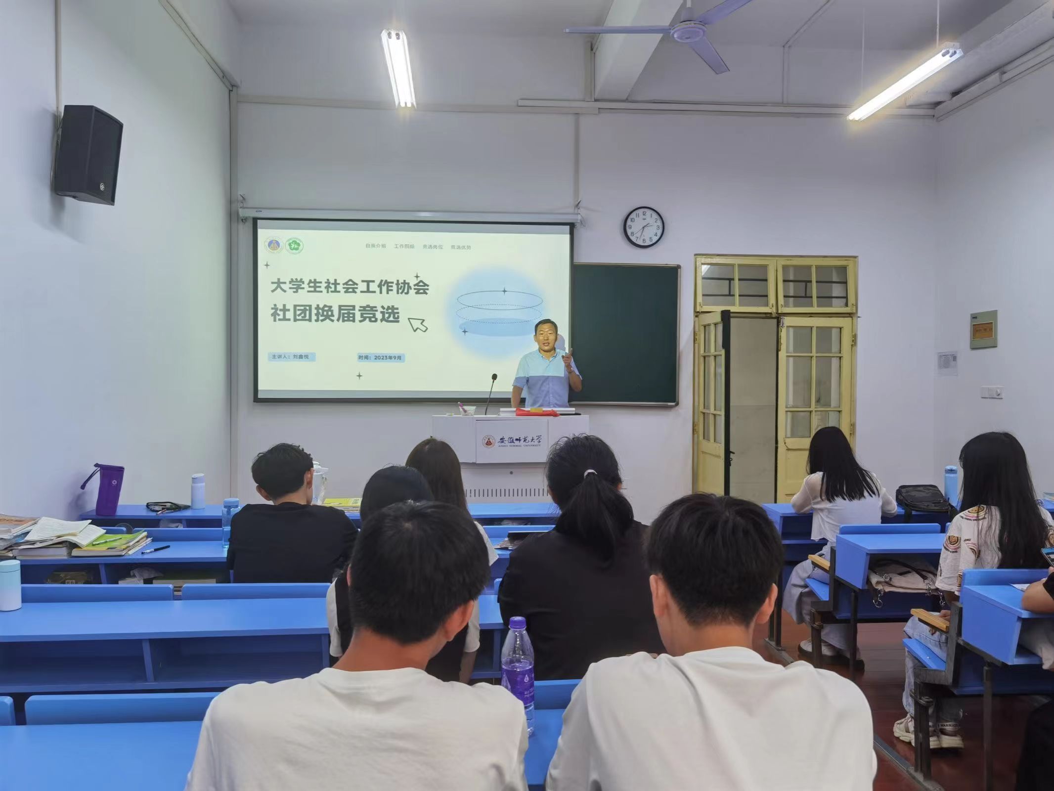 本网讯(大学生社会工作协会 李迎春)9月10日大学生社会工作协会在教学楼1209召开换届大会。本次会议由会长巫艺云主持召开,社团指导老师王杰出席会议,全体竞选同学参加。