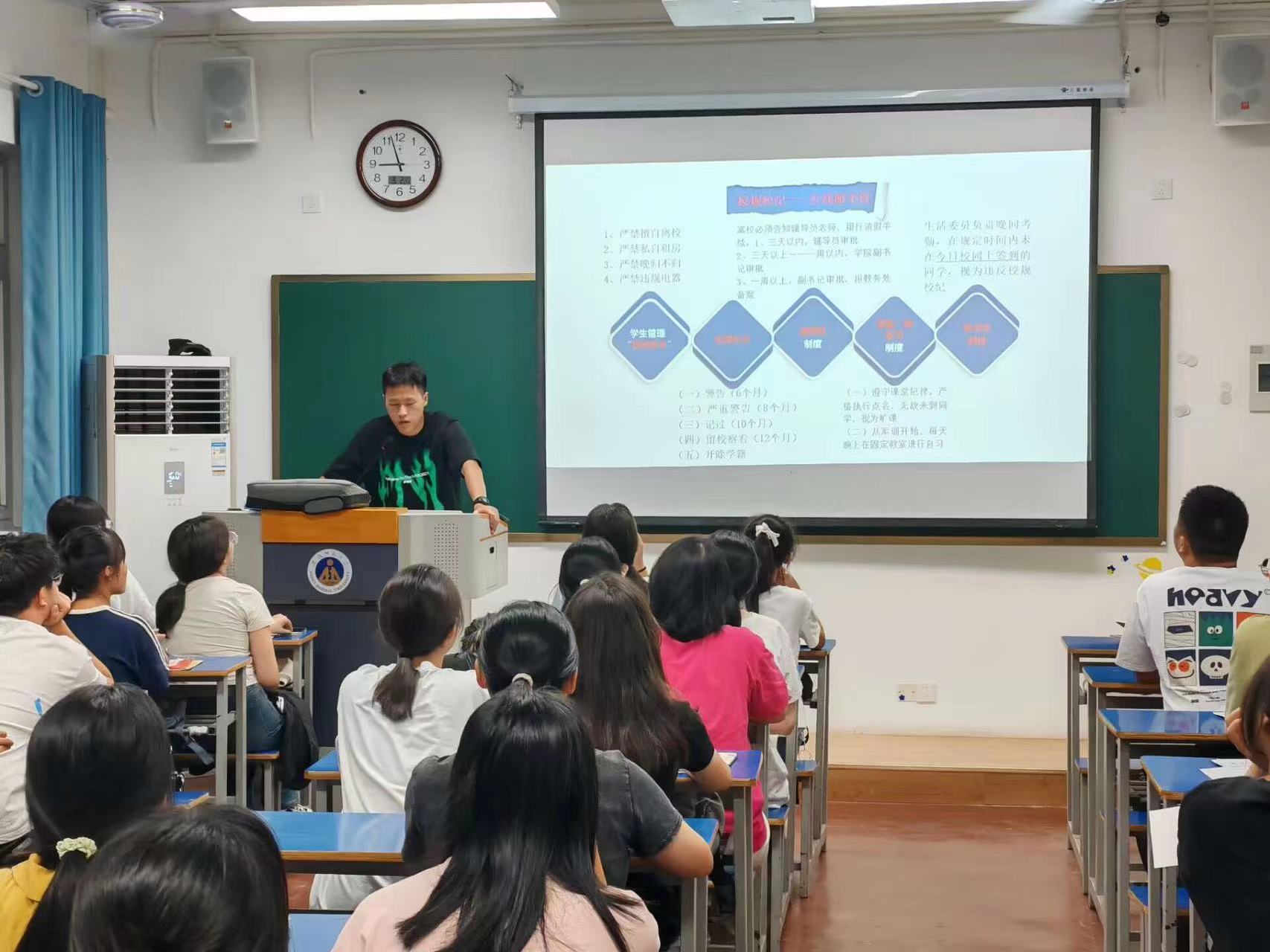 在班会开始之前,马涛向同学们提问:何为大学?何为行政管理专业?同学们积极踊跃地发言,提出自己的见解。随后,他展开自我介绍,强调辅导员主要扮演四种角色:老师、学长、知心朋友和家人。班会伊始,马涛强调大学及其重要性。他列举出《大学》、“大道学术”、“大量自学”、“大人之学”,依次介绍了“大学”的名字出处、释义以及学习方法和策略,由此引出大学的重要性。接着,根据开学报道期间师生之间的相处,马涛提出要“讲文明,懂礼貌,树规矩”。其中尤其强调遵守校规校纪,牢牢把握“四个严禁”、“五种处分”,严格执行请销假制度、晚点名制度,坚持底线思维,违规违纪这一红线碰不得。
