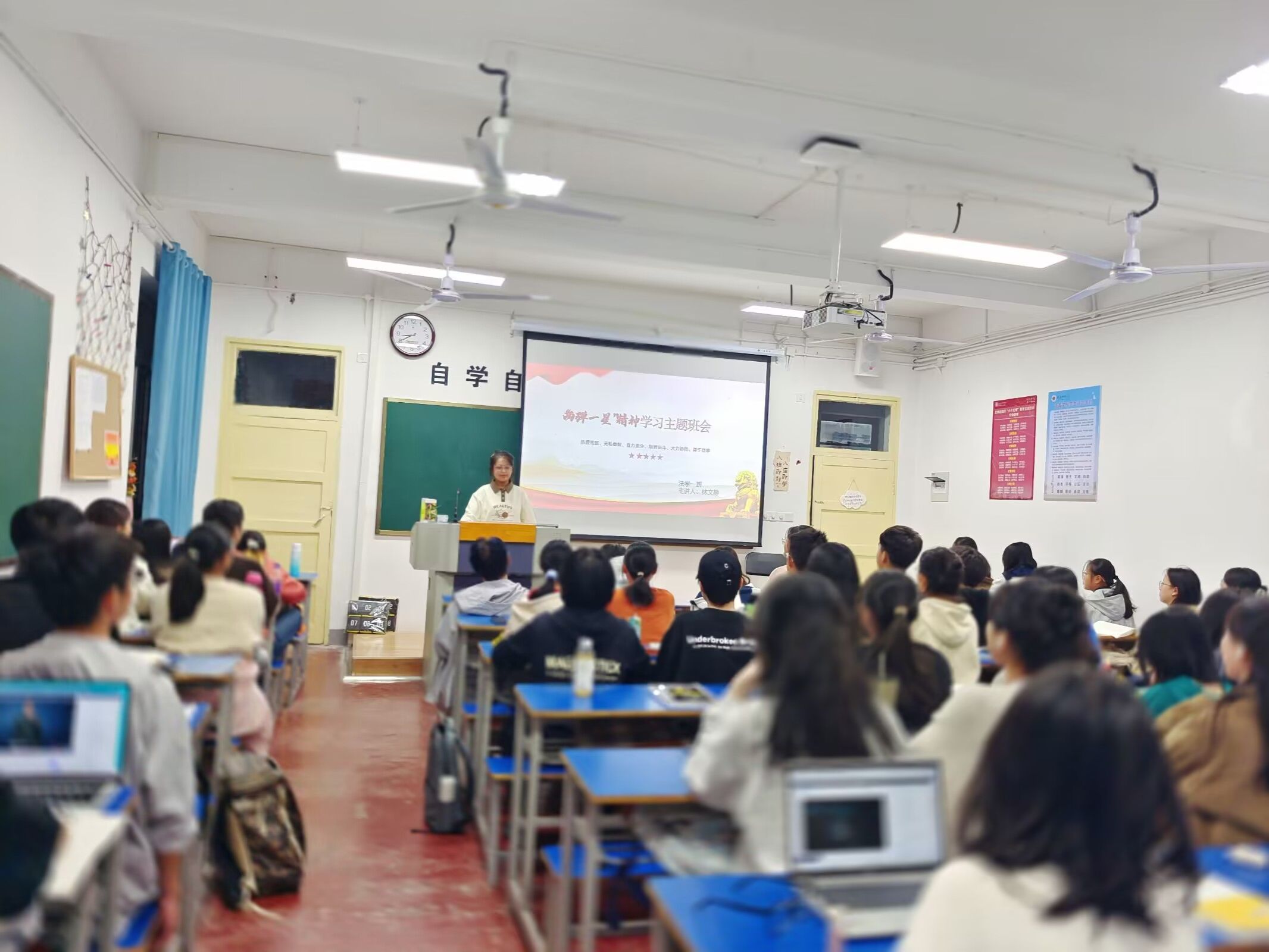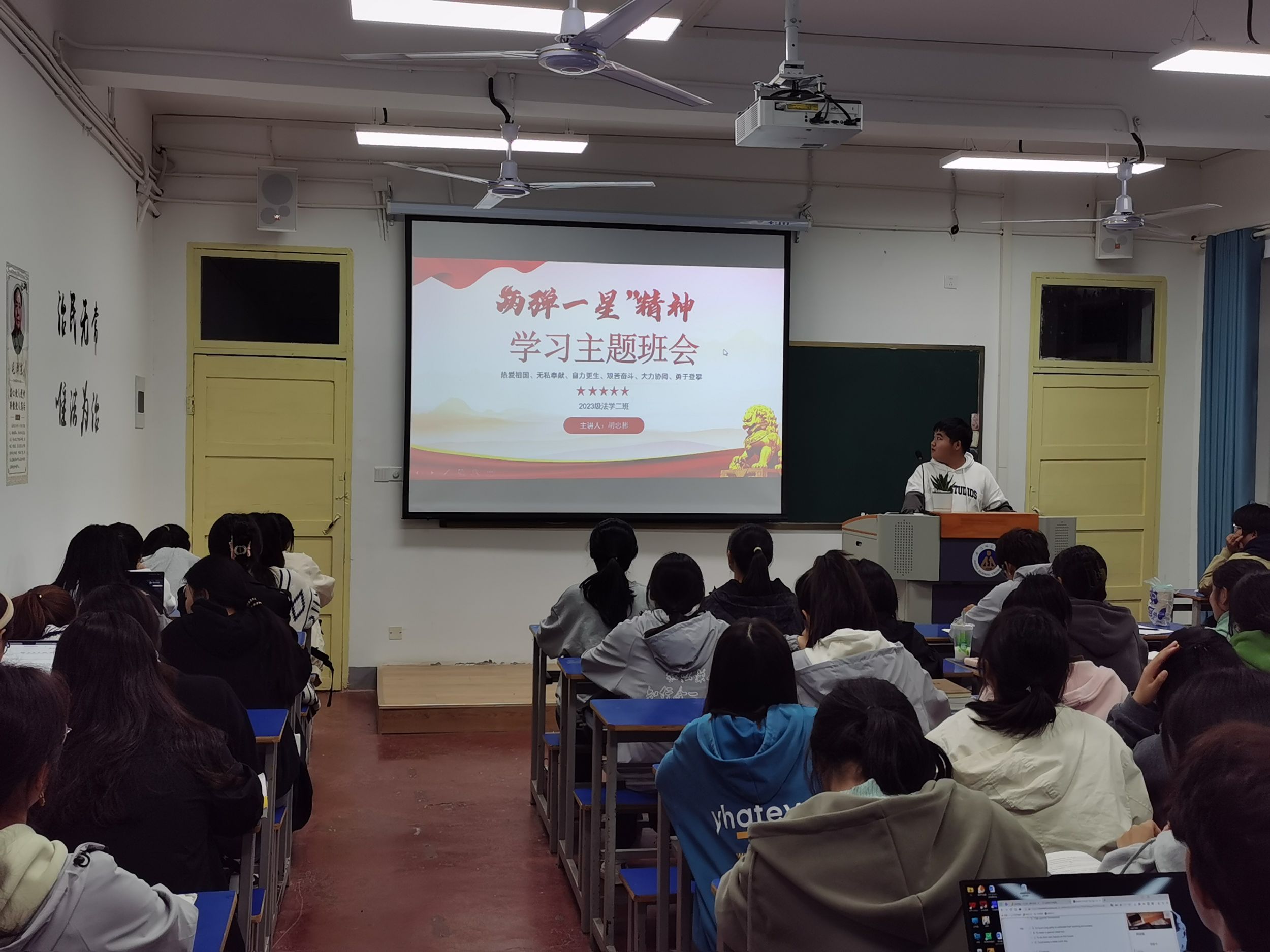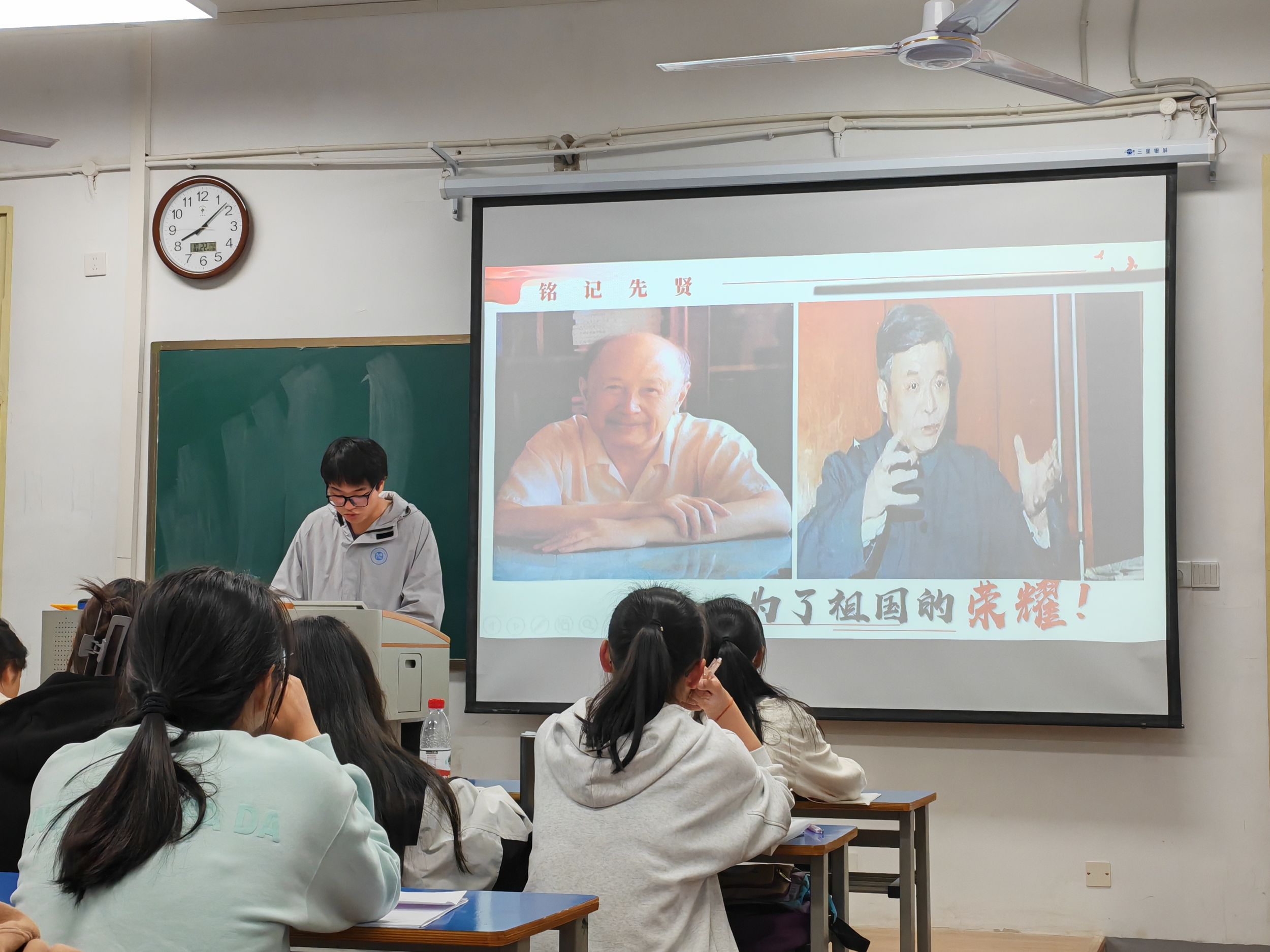 各班级思政委员先后从“两弹一星”和“载人航天”两个方面介绍了中国科研事业的发展历程,为同学们普及了“两弹一星”与“载人航天”的精神内涵,其中并穿插了视频更加生动地加深了同学们对航天路程的了解,同时提醒同学们不仅要铭记先贤,还要站在巨人的肩膀上远眺,再续辉煌的未来。
