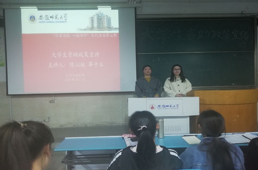 3月17日晚, 2018级行政管理专业在行知楼2010304教室开展第七期“导生交流会”。本次交流会主题是大学生资助政策宣讲,2016级法学二班陈沁瑶、2016级行政管理专业莘子玉作为校“学生资助宣传大使”受邀进行宣讲。交流会由班委张喆主持,18行管全体同学参与其中。