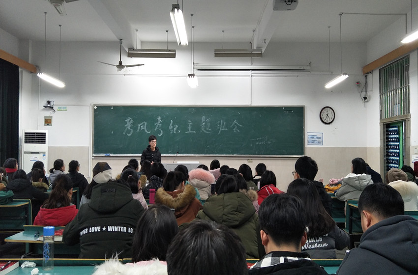 在考风考纪方面,班长首先强调,诚信是一个道德范畴,民无信不立,大学生应该把诚信考试作为最基本的道德规范。班长结合校纪校规,向同学们详细介绍了关于作弊的处分规定,进一步端正考风,严肃考纪。