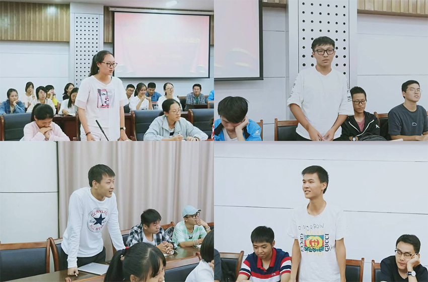 行政管理的吴芳同学从健康、坚持、心态、读书、恋爱、工作六个方面分别提出自己的观点。她指出在努力学习的同时加强对身体的锻炼也是很有必要的,我们要尽可能提高自己的能力,多激励自己,通过读书使自己更加清楚想要得到的究竟是什么;莘子玉将自己的心得归纳为三个瞬间,在濒临崩溃时是选择坚持还是放弃这个问题上,她通过展示一些照片,向新生们表达了自己的看法。她用自己在暑期社会实践的见闻,表达了她在为农村留守儿童支教中获得的感悟,以此来启发同学们;陈朋建议同学们要培养良好的适应力,既来之则安之,做好自我定位,提高自己的判断力。同时,她提醒同学们要注意网上言论自由的问题,多注意与父母联系沟通。