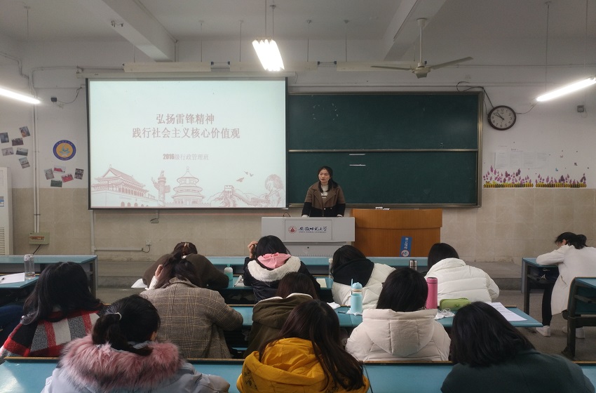 3月20日上午,2016级行政管理班级在行知楼2010304教室召开“弘扬雷锋精神,践行社会主义核心价值观”主题班会。班会由班级团支部书记陈朋主持,16行管全体成员参与其中。