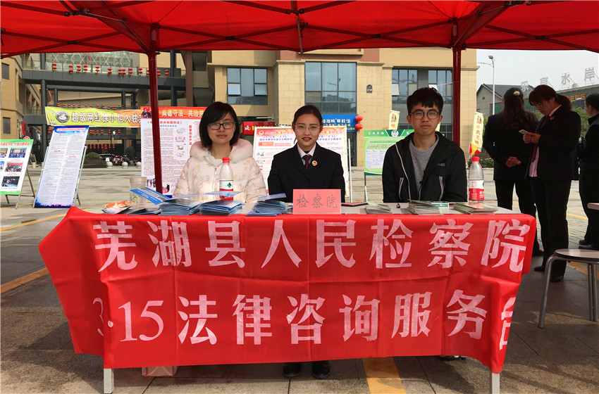 3月15日上午,2015级法学专业芜湖县人民检察院实习小组同学和检察院工作人员一起,开展了3·15消费者权益保护普法宣传活动。