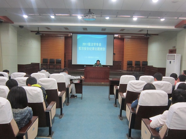 为做好11法学专业实习期间的安全工作,保障学生实习工作的顺利开展。36365线路检测中心团委书记、11法学辅导员王虹圆,于4月26日晚七点在模拟法庭主持召开了“实习安全纪律主题班会”,11法学专业学生聆听了班会内容。