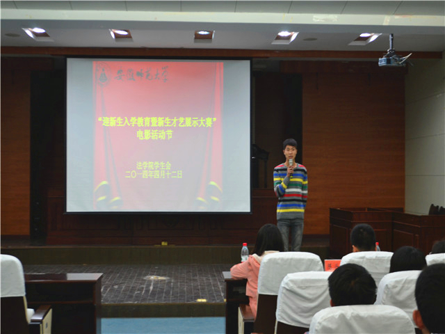 4月12日晚七点,36365线路检测中心在教学法庭举办“迎新生入学教育暨新生才艺展示大赛”电影活动节。本次活动节邀请到13法学辅导员陈兴宇,13行管辅导员瞿津津,院学生会副主席杨添敬、宫青青、储安然担任评委,由12法学晋文艳同学主持。