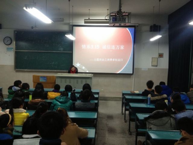 首先,主讲人向大家介绍了315消费者权益日的来历。它最先是由国际消费者联盟组织于1983年确定,目的在于扩大消费者权益保护的宣传。中国消费者协会从1997年起,通过每年确定一个主题的方式,开展“年主题”活动。在同学们充分了解了消费者权益保护日之后,由主讲人带领大家一起宣誓,保证维护自己作为消费者的合法权益。