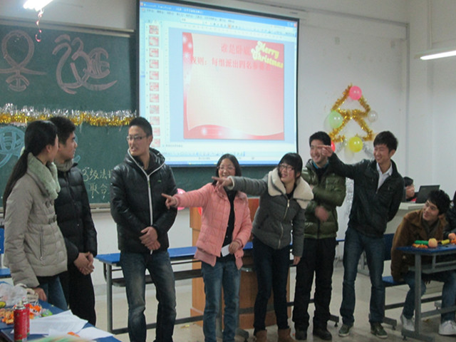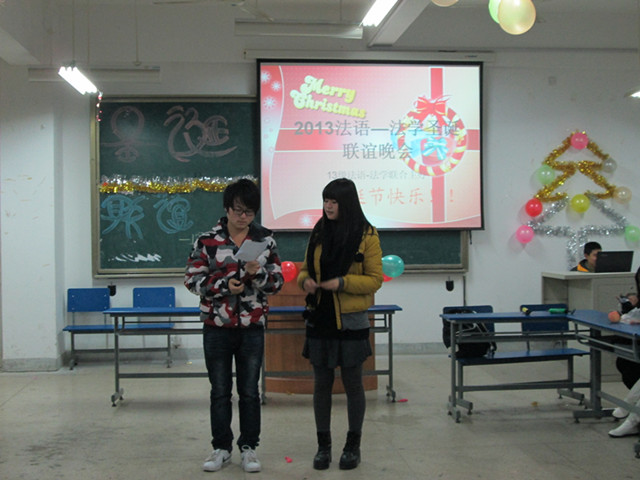 为增强同学之间的友谊,丰富班级文化活动,加强与其他学院的文化交流,法学二班于12月24日晚七点在外国语学院2080108教室与13法语系的同学举办联谊晚会。晚会由法学专业的丁庭威和法语专业的朱子璇主持。