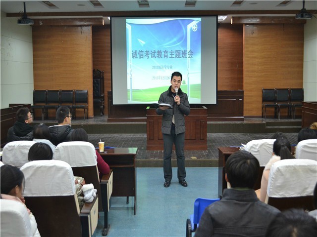 在期末考试即将到来之际,为端正考风、严肃考纪,强化同学们诚信考试意识,2013年12月26日晚,2013级法学专业辅导员陈兴宇老师组织全体同学在教学法庭召开了关于“诚信考试”的主题教育班会。