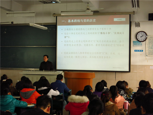 胡安全从“党的基本路线与党的历史”、“现阶段基本路线的形成”、“现阶段基本路线的内涵”以及“坚持基本路线不动摇”四个方向讲解了党在探索基本路线过程中波澜壮阔的历史和伟大品格及深刻教训,让我们更加坚信“党的基本路线是党和国家的生命线”的硬道理,激发了同学们自觉投身祖国现代化建设的积极性和进取心,理论指导实践,我们祖国一定会更好。