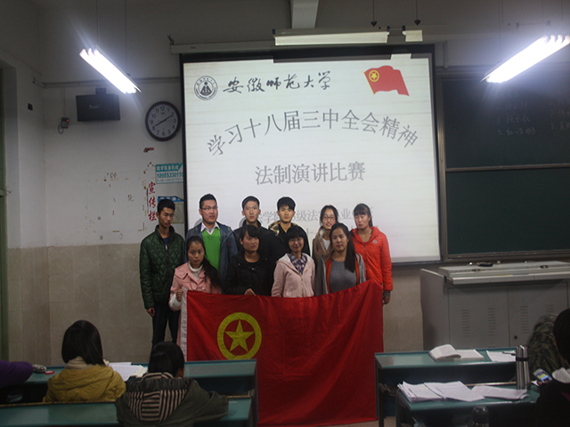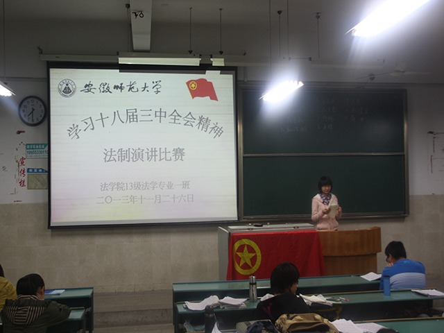 为了让同学们更好的学习十八届三中全会精神和思想,2013年11月26日晚七点,在教室2010401开展了“学习十八大精神的演讲比赛”,此次比赛由班级团支部组织开展。