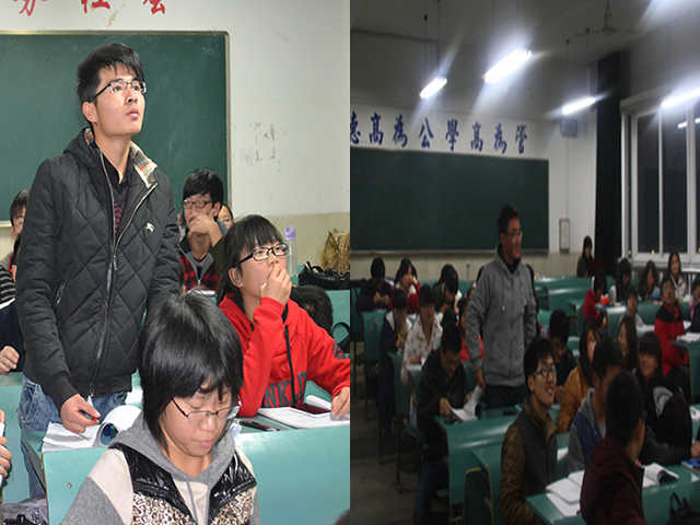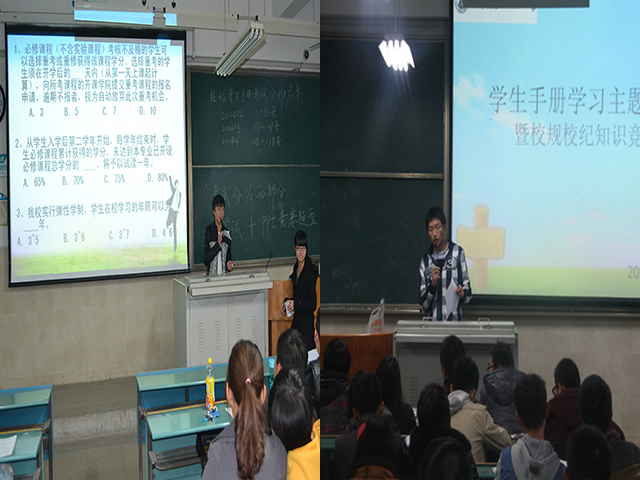 为加强班级管理、维护同学们正常的学习生活秩序、营造一个更好的学习与生活的校园环境。20131127日晚,2013级法学1班、2班分别在教室20104012010402举行校纪校规模拟考试、校规校纪学习知识竞赛,两班学习委员分别担任知识竞赛的主持人和模拟考试的监考老师。