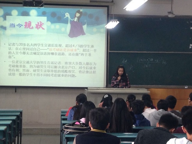 班会依然延续着“职业生涯规划”的中心思想,直接切入最困扰当代大学生的毕业选择问题,让同学们深刻认识到,未来已来。实际上很多同学都陷入了考研和就业抉择的怪圈,不能正确的认识自己,达不到果断做出适合自己的抉择效果。班会提出了若干适合考研的人的特质,让同学们对号入座,比如:有坚持上自习的恒心,有对做学问锲而不舍的精神,有天天7点起床12点睡觉的保证等等。班会也指出,考研不是作为就业的对立面而存在,相反,增加专业知识能才能更好的适应职场生活。
