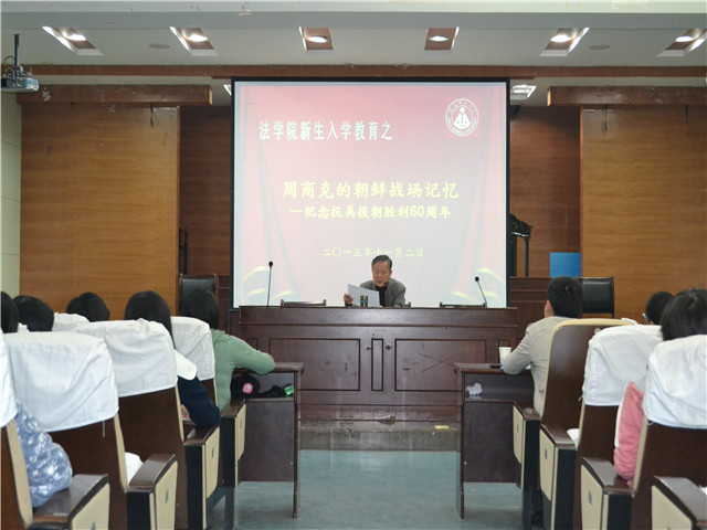 11月2日下午,36365线路检测中心特邀校关工委报告团、原抗美援朝志愿军周商克老师在模拟法庭为大一新生作了一场主题为“周商克的朝鲜战场记忆”暨纪念抗美援朝胜利60周年报告会。活动由13级法学辅导员陈兴宇主持,13级行管辅导员瞿津津参加。