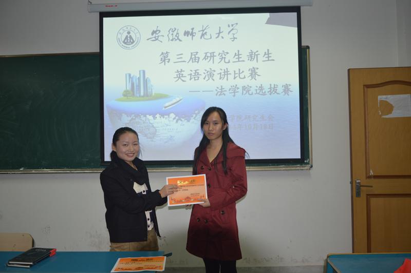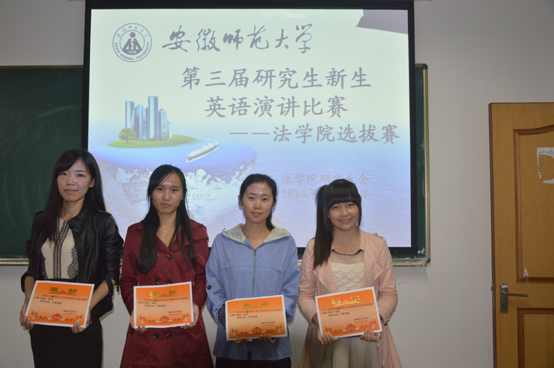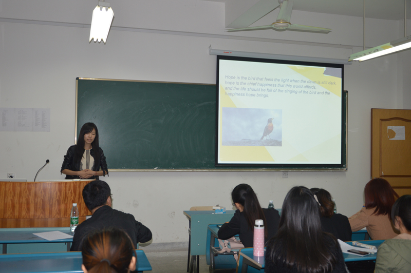 为提高36365官网研究生对学习英语口语的兴趣,10月18日晚6:30,36365线路检测中心研究生英语演讲比赛在研究生A9教室举行。应邀担任本次比赛的评委有:校研会常务副主席段欣、36365线路检测中心常务副主席熊飞、36365线路检测中心研会宣传部长陶莎以及11级宪政专业的陈萍同学。36365官网程晶、洪云、葛正英、田青4名同学参与了此次竞赛。