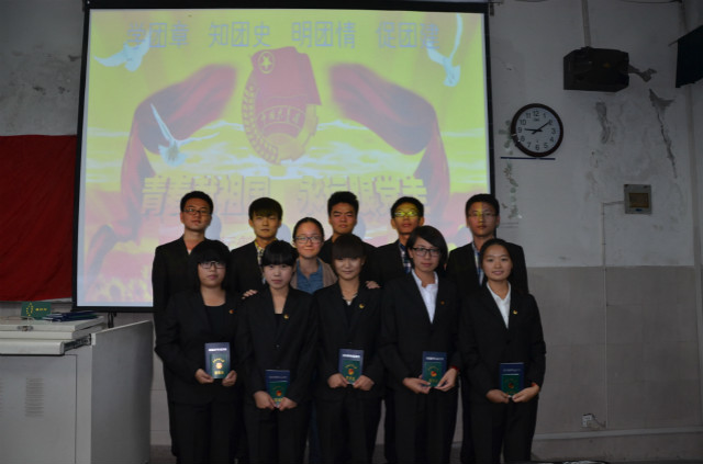 活动开始,李锦霞向同学们介绍了中国共青团自1922年成立以来九十多年的发展历程,马艳同学带领着同学们学习了团章、团徽、团旗相关知识。瞿津津老师为团员们佩戴团徽,颁发团员证。在领到团员证后,全体团员起立在团支部书记带领下重温了共青团宣誓誓词。同学们热情澎湃,举起右臂大声呼出“为共产主义事业而奋斗”的誓词。