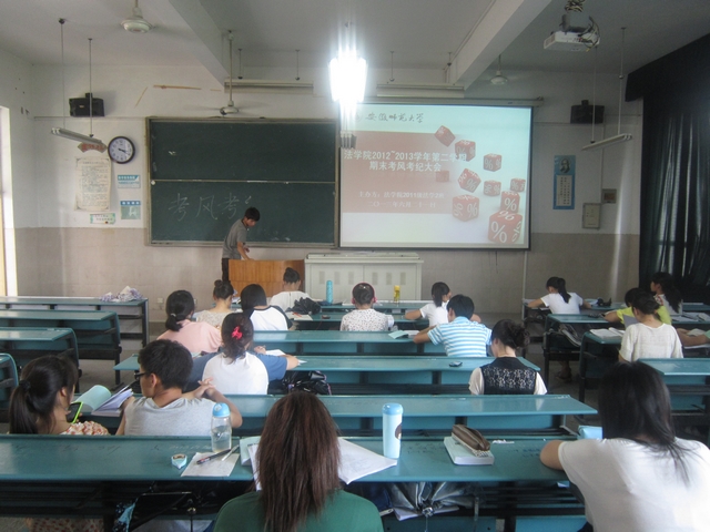 6月21日下午3点左右,11法学2班在2020303教室召开了“2012—2013学年第二学期期末考风考纪大会”。同生们悉数到场,大会由班长储安然主持。
